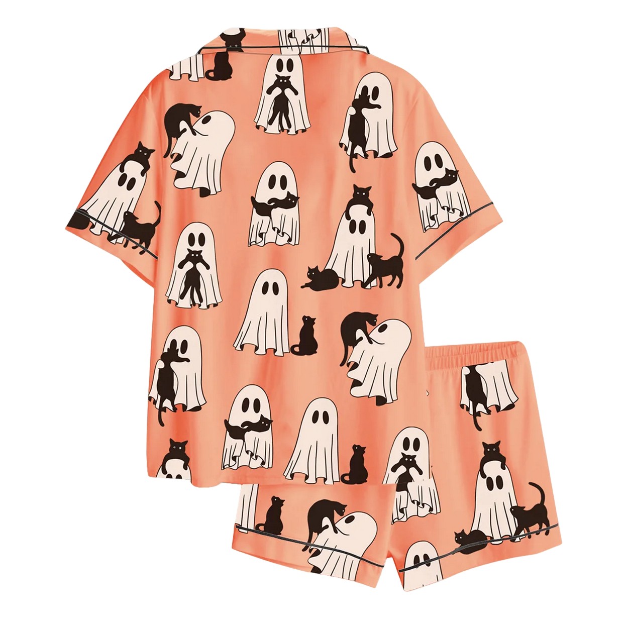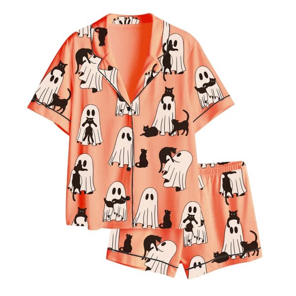The set includes a short-sleeve button-up top with a notched collar and matching shorts, both adorned with the charming ghost-cat pattern. The satin finish offers a luxurious, silky feel, while the spandex adds a gentle stretch for all-day comfort. Black piping along the edges enhances the retro vibe, and the playful interaction between ghosts and cats creates a fun, festive look that stands out during the spooky season.