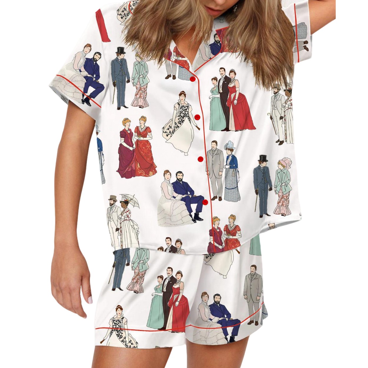 Indulge in a touch of historical luxury with our “Gilded Ages TV Show Bertha Russell Silky Satin Pajama Set.” It’s the ideal gift for fans of the show or a decadent treat for yourself. Live like a socialite and bring a piece of historical elegance into your home. Order yours today and step into the world of the Gilded Age!