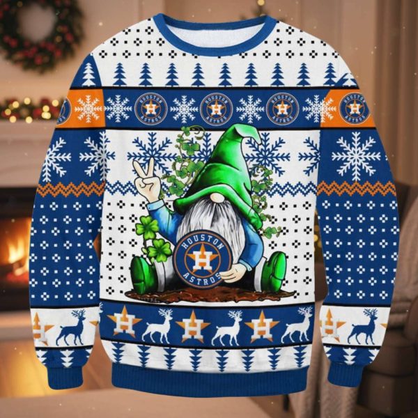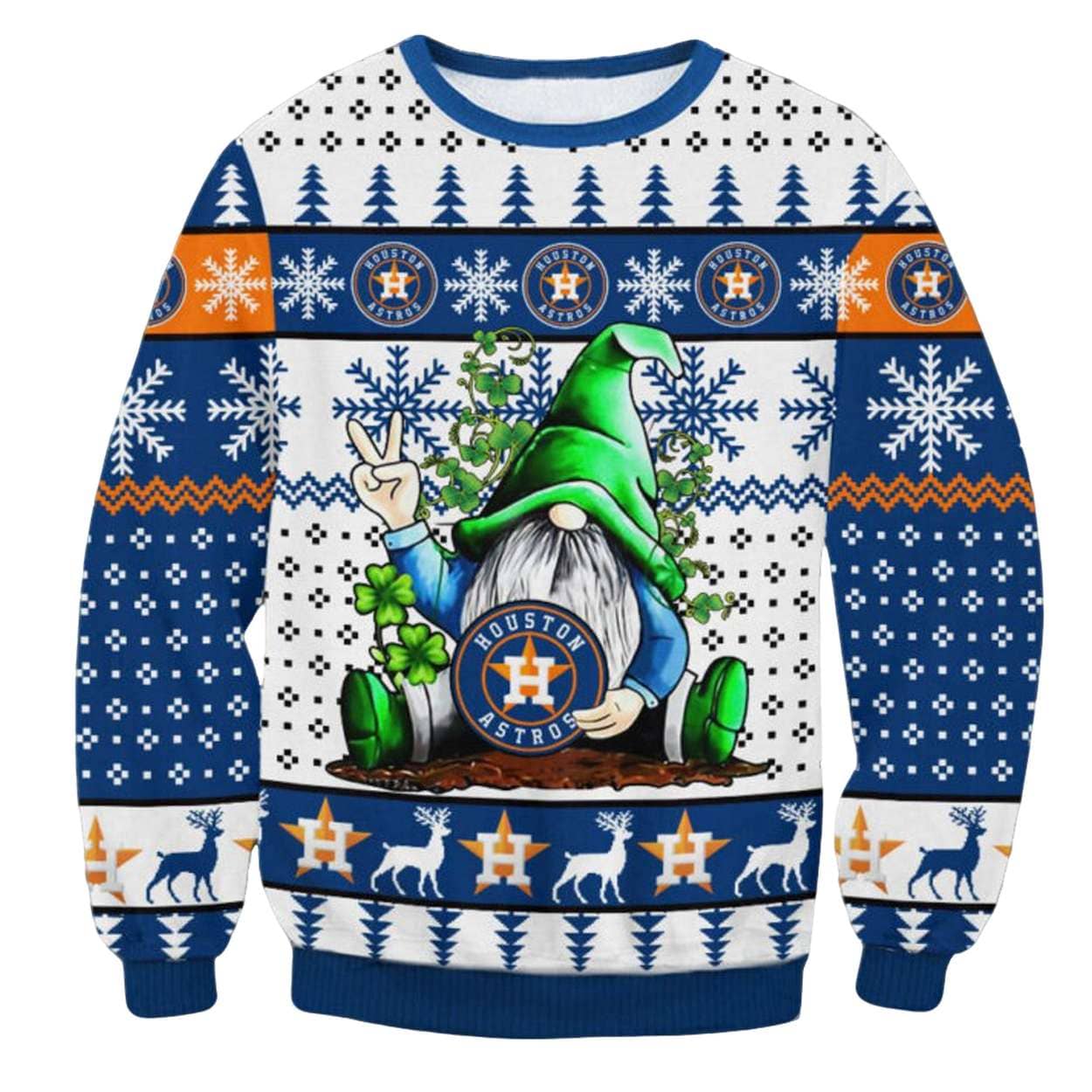 The sweater features a classic, cozy White and Royal Blue color scheme, perfectly matching the Astros’ primary colors. It’s richly adorned with traditional, Nordic-style holiday patterns: snowflakes, reindeer, pine trees, and geometric bands accented with the team’s signature orange. The centerpiece is a whimsical, full-color graphic of a lucky gnome, wearing a towering green hat and sitting next to a patch of shamrocks for extra good fortune. The gnome is surrounded by the Astros star logo, and he confidently flashes the peace sign, making this a unique and spirited holiday statement.