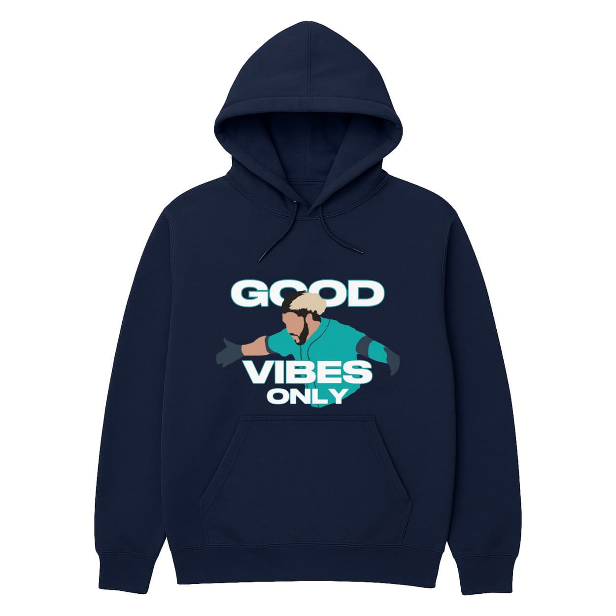 - This stunning piece features a vibrant design of Geno Suarez in action, paired with bold “GOOD VIBES ONLY” text in white and teal, set against a sleek navy background.