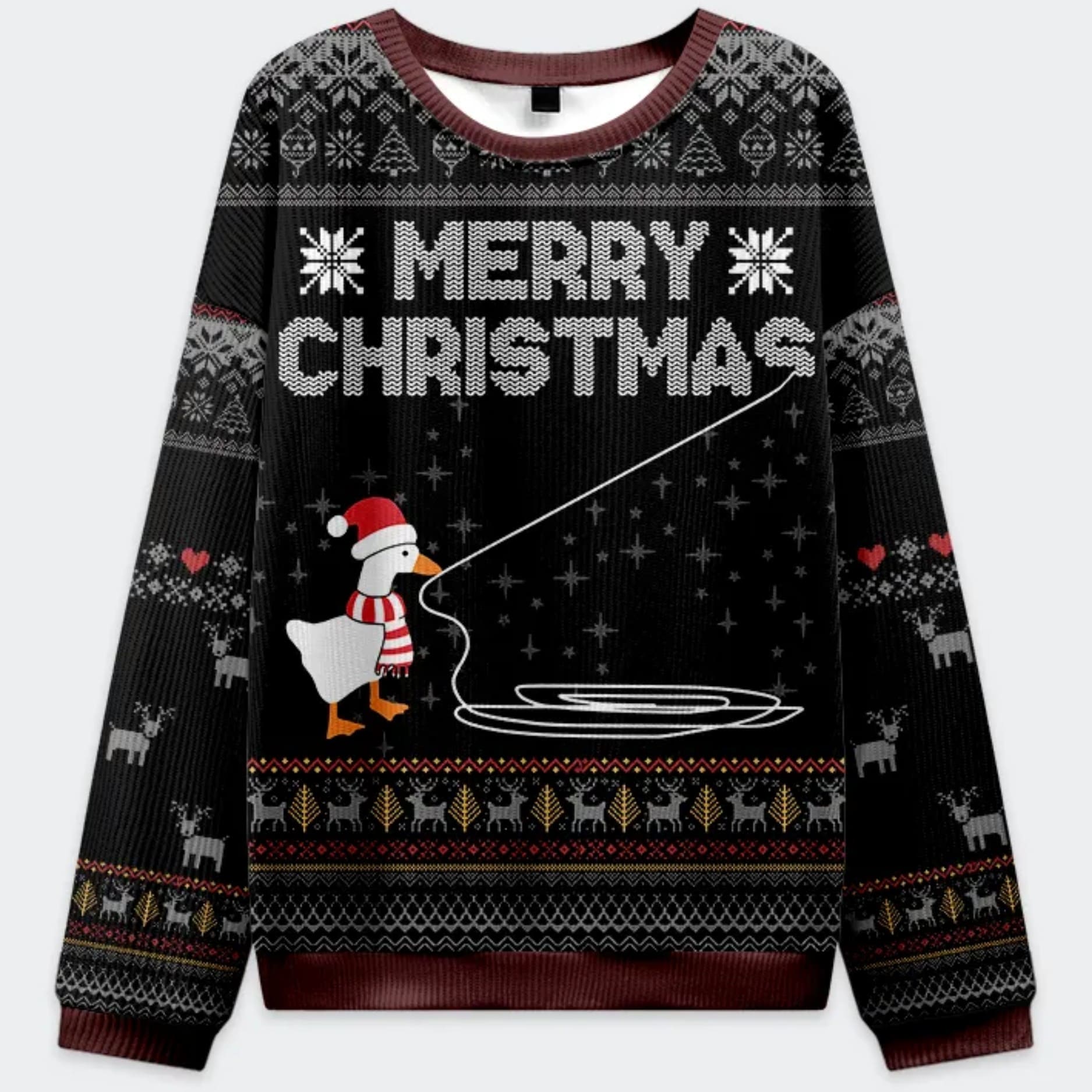 This truly original design features a charming goose, complete with a Santa hat and a cozy scarf, in the act of comically “unraveling” itself – pulling out a long string of what appears to be its own wool. Above this amusing scene, the words “* MERRY * CHRISTMAS *” are emblazoned, adding to the playful absurdity. The classic ugly Christmas sweater pattern is given a sophisticated twist with a black background, accented by a deep red and grey fair isle design featuring snowflakes, hearts, reindeer, and abstract patterns. Crafted from soft, durable polyester, this sweater provides comfortable warmth without the itchiness of traditional wool, ensuring you stay cozy while turning heads at any holiday gathering.