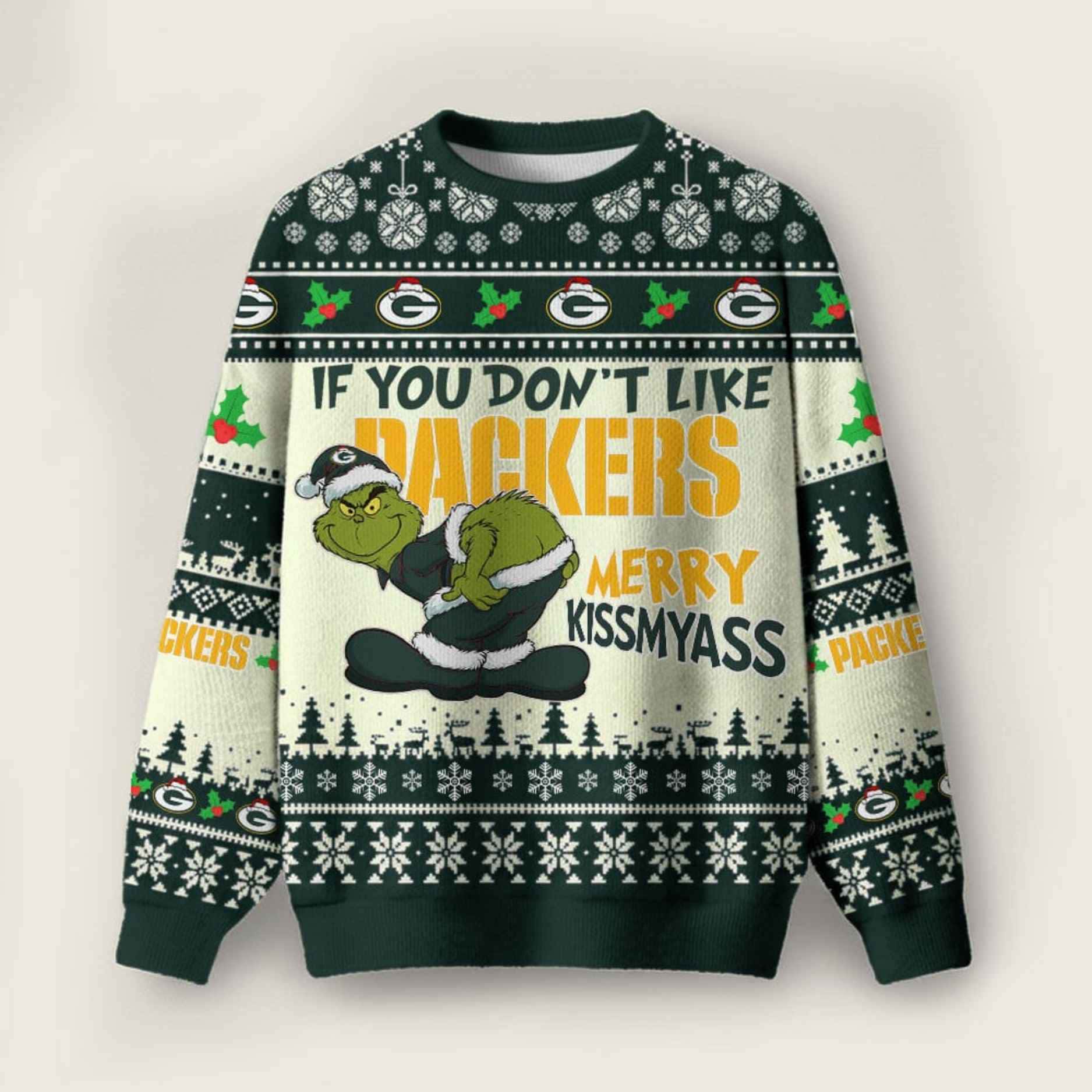 Shut down rival fans and flaunt your unwavering GB Packers pride this holiday season with the hilarious “Grnch If You Don’t Like Packers Merry Kissmyass Ugly Christmas Sweater”!