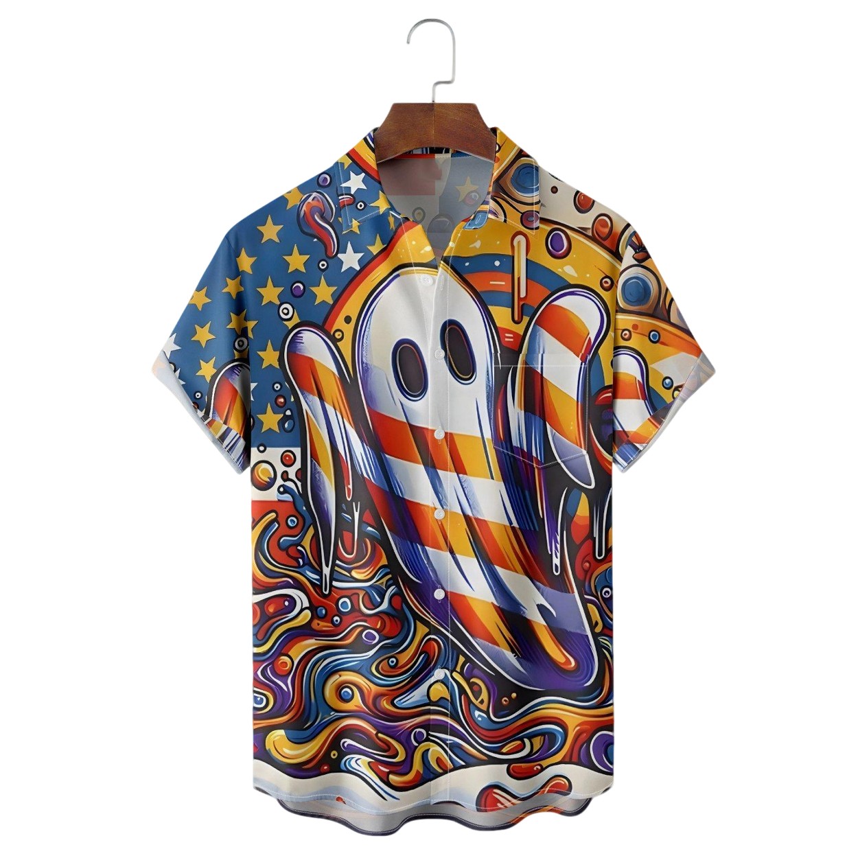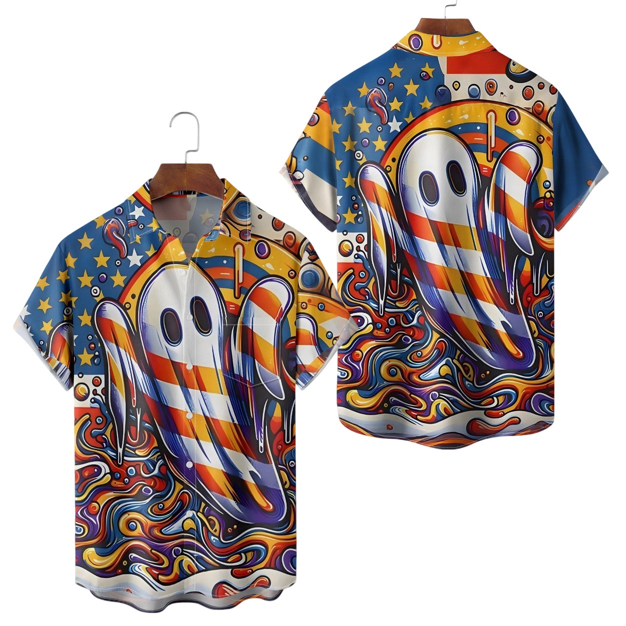 Spooky & patriotic! This S-5XL Hawaiian shirt features a ghost & American flag design on polyester. Perfect for Halloween, comfy & durable. Order now!