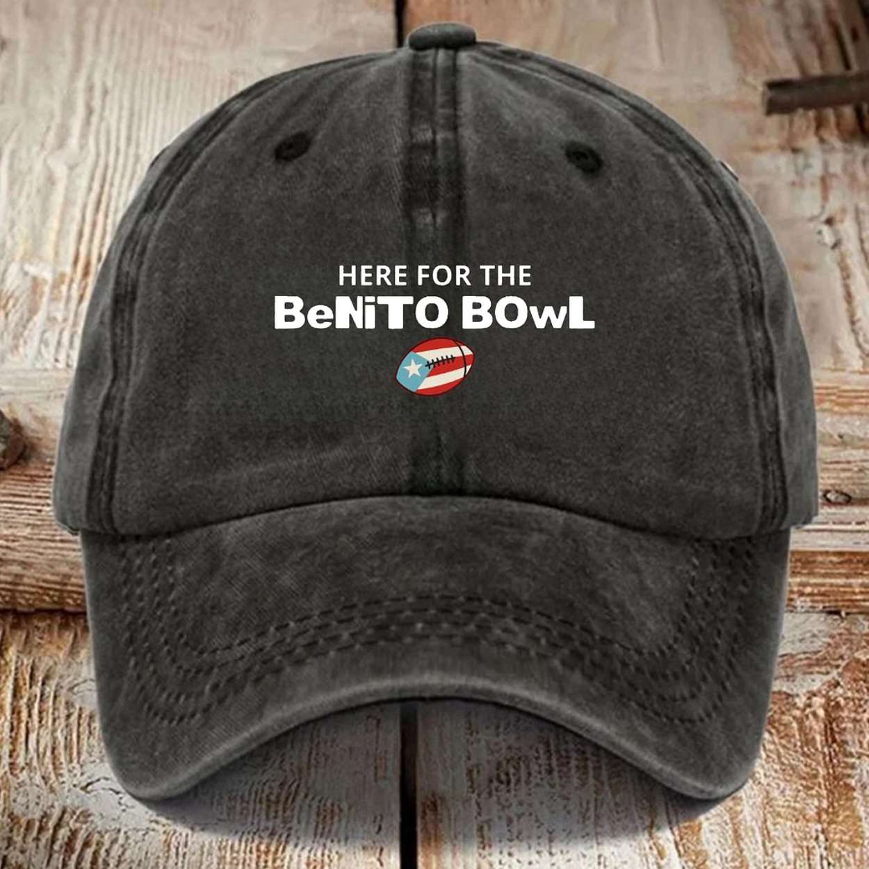 - Front Panel: The front is embroidered with the clear, playful statement: “HERE FOR THE BeNiTO BOWL.” The witty, mixed-case lettering gives it a modern, casual feel.