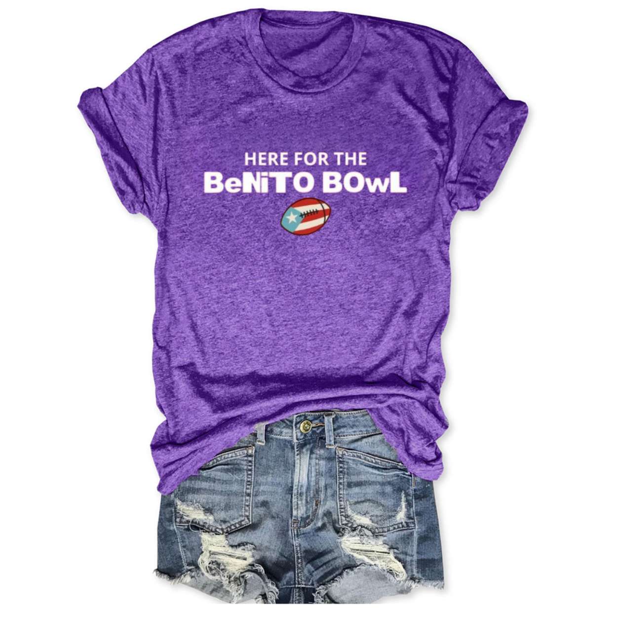 The shirt features the bold, eye-catching text: “HERE FOR THE BËNITO BOWL” (using the stylistic umlaut often associated with his brand). The design is centered around a unique graphic: a classic football is adorned with the colors and star of the Puerto Rican flag, connecting the game-day excitement with Bad Bunny’s proud heritage.