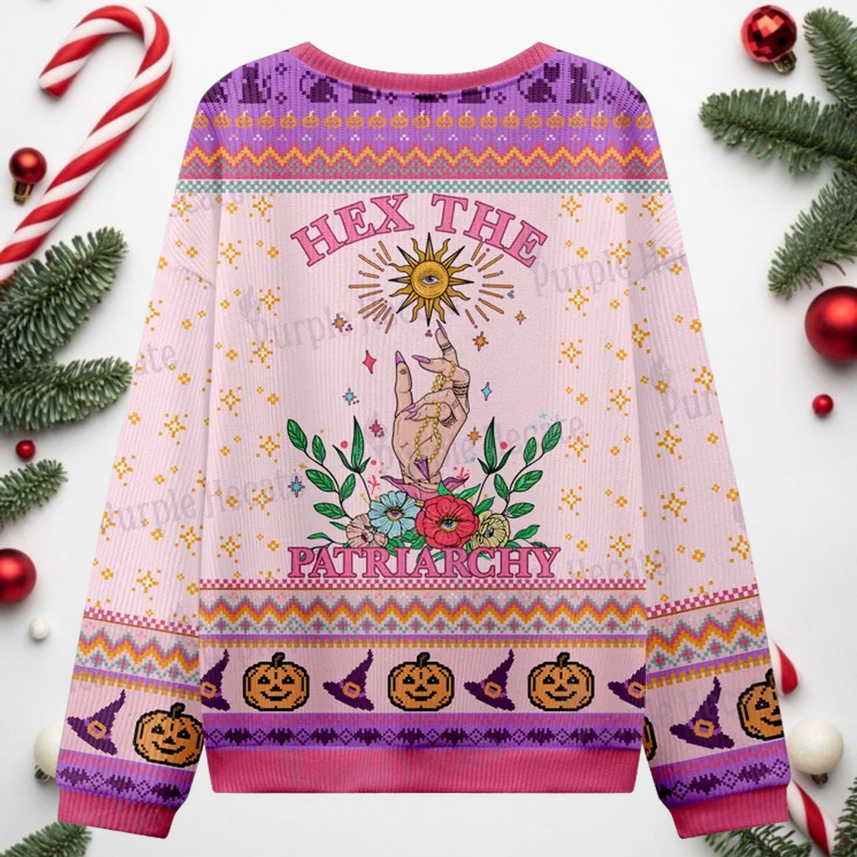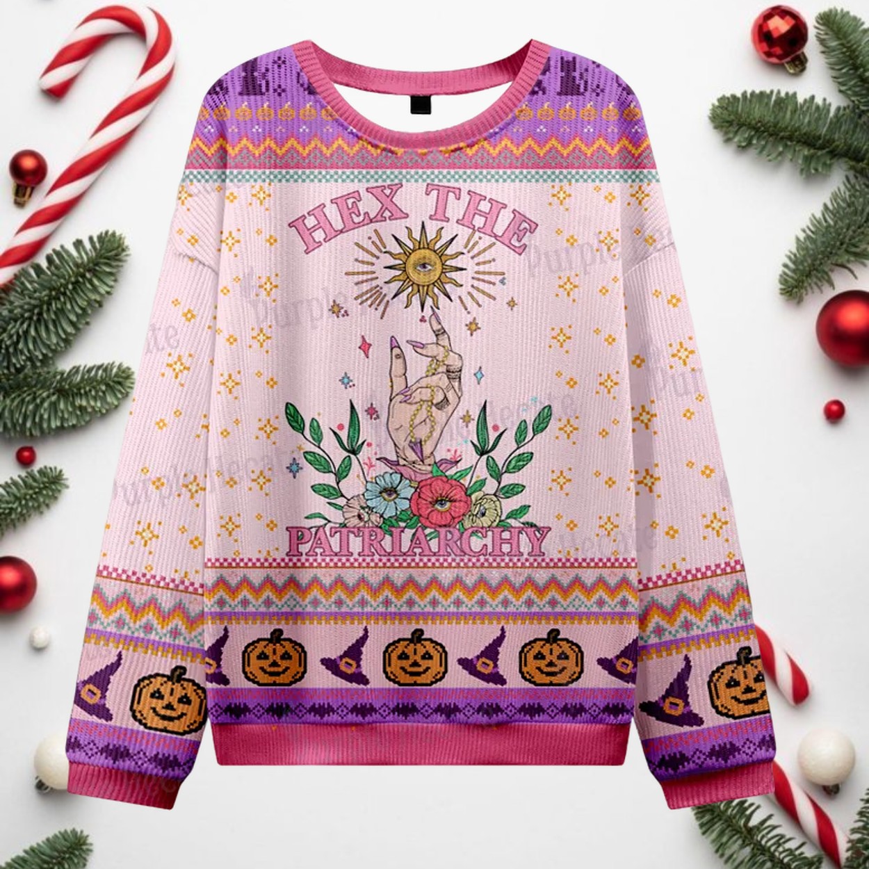 This Halloween, let your style do the talking with our ‘Hex The Patriarchy Witchy Ugly Halloween Sweater’. It’s the perfect blend of spooky and empowering, designed for those who want to celebrate the season with a purpose. The central design features a powerful hand casting a spell with floral accents and a radiant sun, all framed by the bold declaration, “Hex The Patriarchy.” The sweater’s vibrant pink and purple color scheme is complemented by playful patterns of pumpkins, spiderwebs, and witch hats, making it a unique and eye-catching piece for any festive gathering.