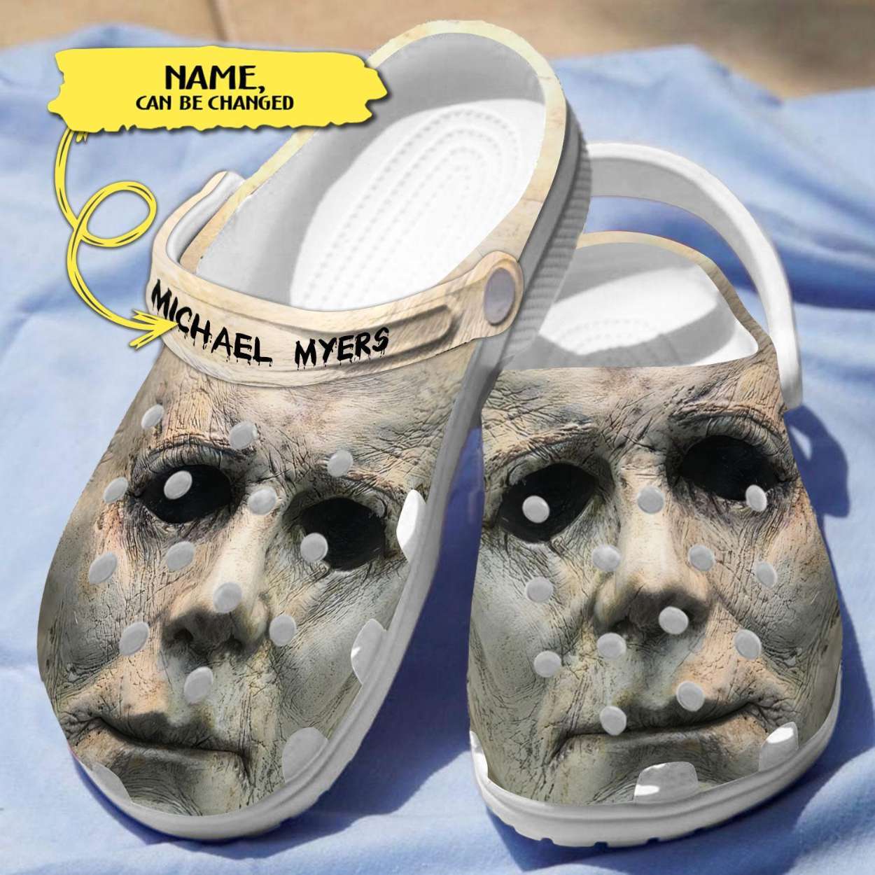 Don’t just watch the horror, wear it! Customize your name and Order your Michael Myers Face Crocs today to step up your horror style for Halloween, convention season.