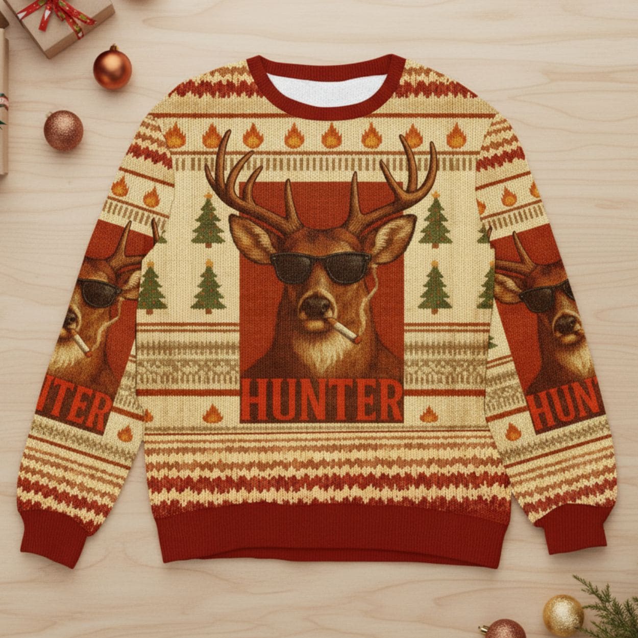 Ditch the drab holiday knits and step out in swagger with the Hunter Smoking Deer Ugly Christmas Sweater!