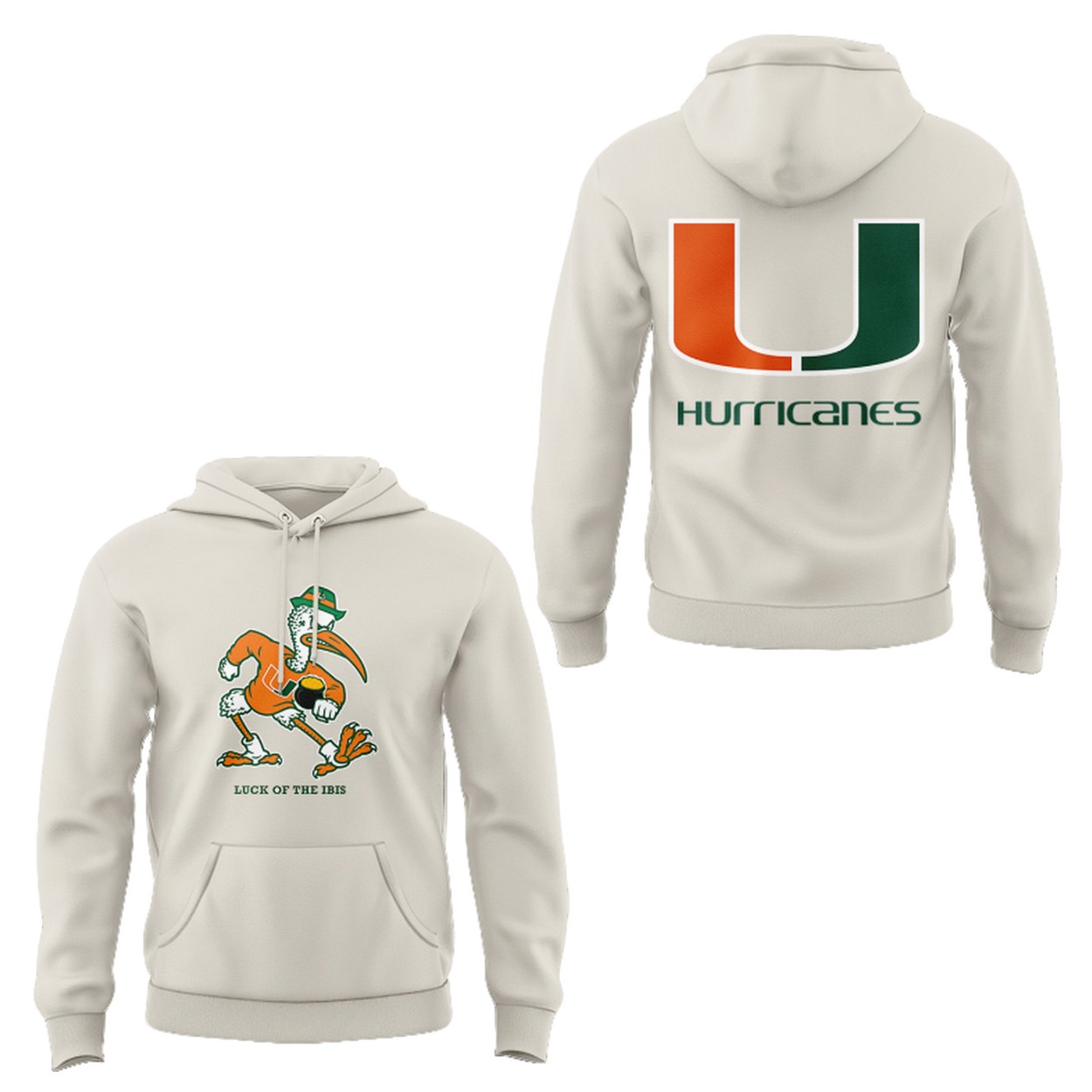 The front of this stylish cream-colored shirt features a vibrant, retro-inspired graphic of the beloved Hurricanes mascot, Sebastian the Ibis, sporting a green hat. Below him, the phrase “LUCK OF THE IBIS” is boldly displayed, celebrating the team’s iconic symbol of good fortune.