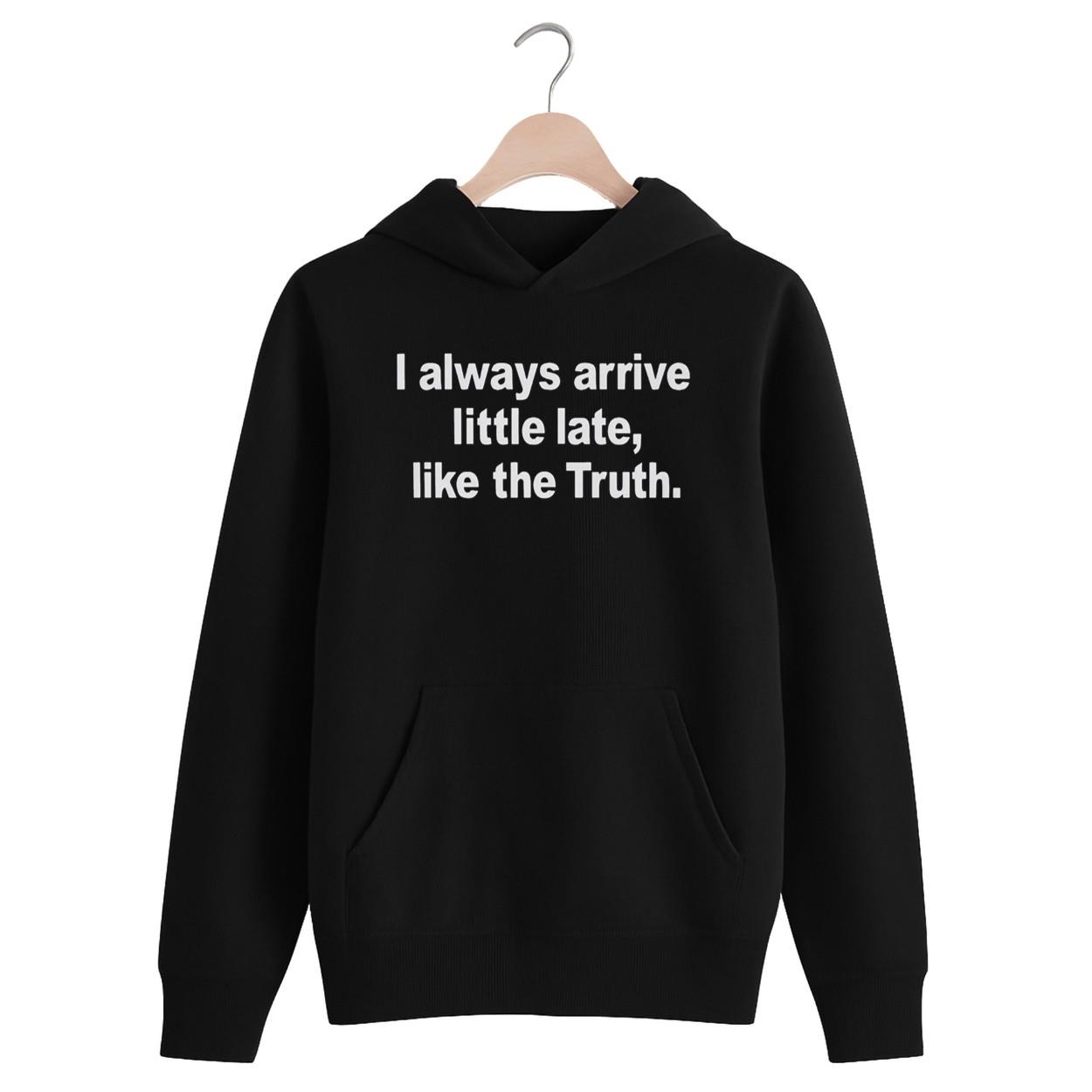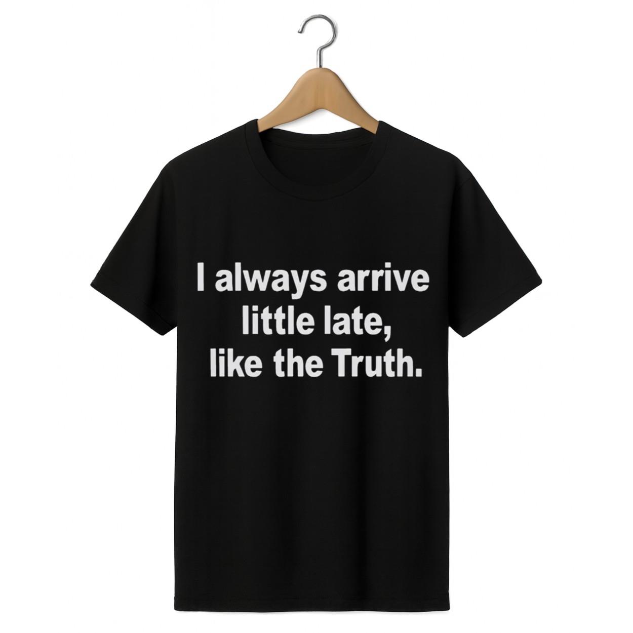 - The Slogan: The full phrase “I always arrive a little late, like the Truth.” is printed boldly across the chest in large, contrasting white block letters.