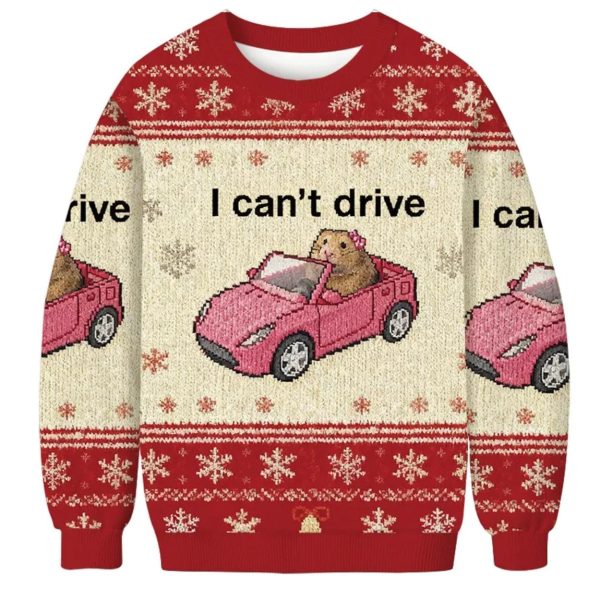 This viral sensation-turned-sweater features a classic ugly Christmas pattern in festive red and off-white, complete with snowflakes, stripes, and subtle holiday bell accents. The core of the design is the meme itself: a repeated graphic of an adorable hamster (wearing a pink bow!) driving a tiny pink convertible. The text clearly states the punchline, “I can’t drive,” making it a perfect conversation starter and a guaranteed source of laughter. Available in an inclusive size range from S to 6XL.