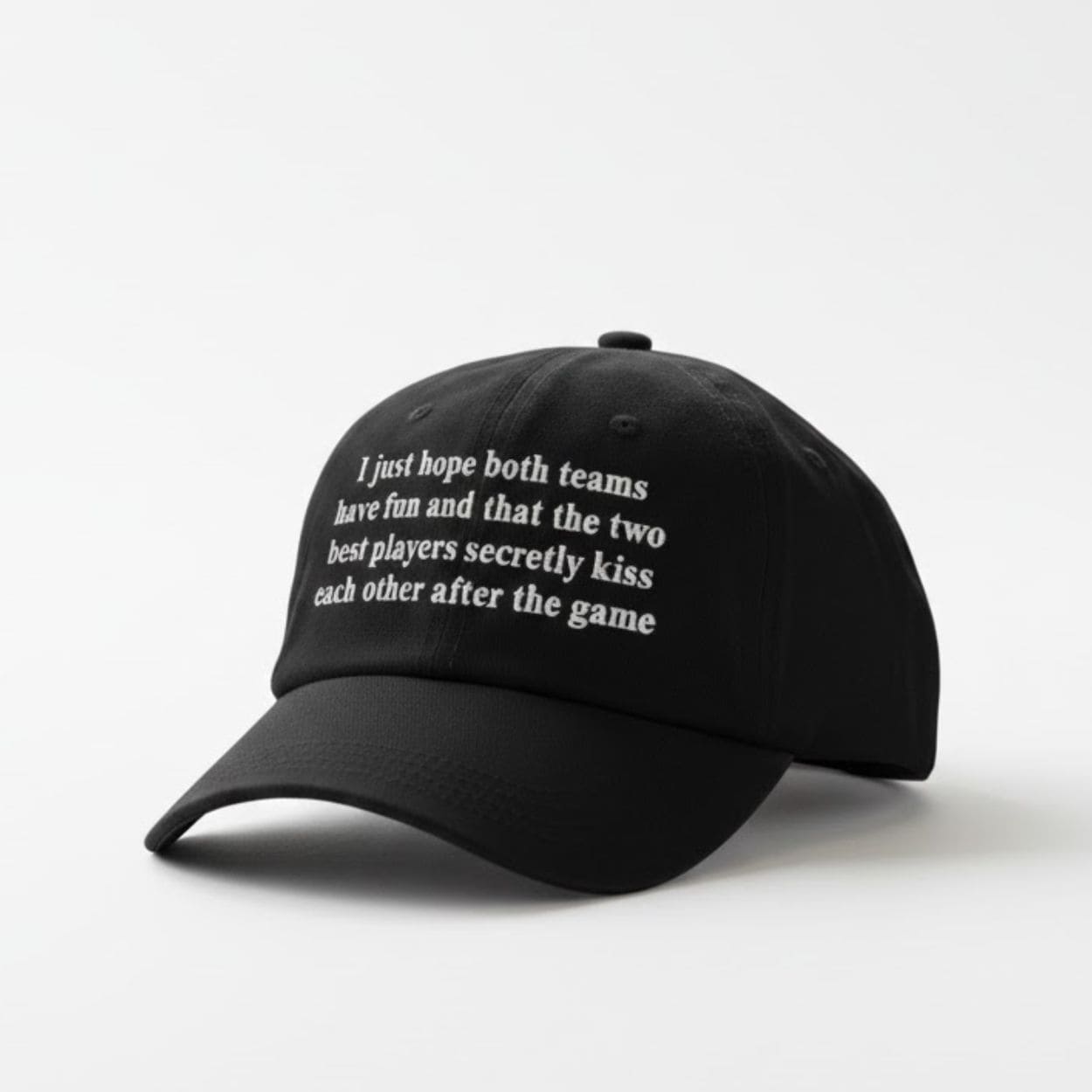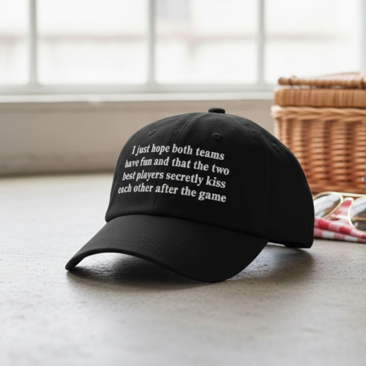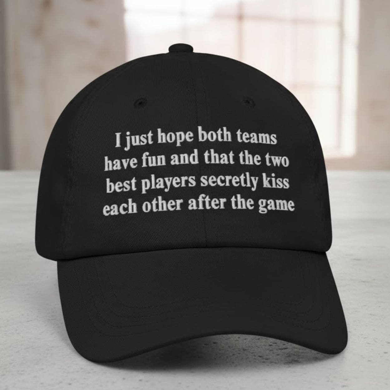 Introducing the “I Just Hope That Both Teams Have Fun Hat”, designed for the sports enthusiast who prioritizes wholesome entertainment, good vibes, and, let’s be honest, a little bit of off-field romance. This black embroidered dad hat is the perfect accessory for game days, tailgates.