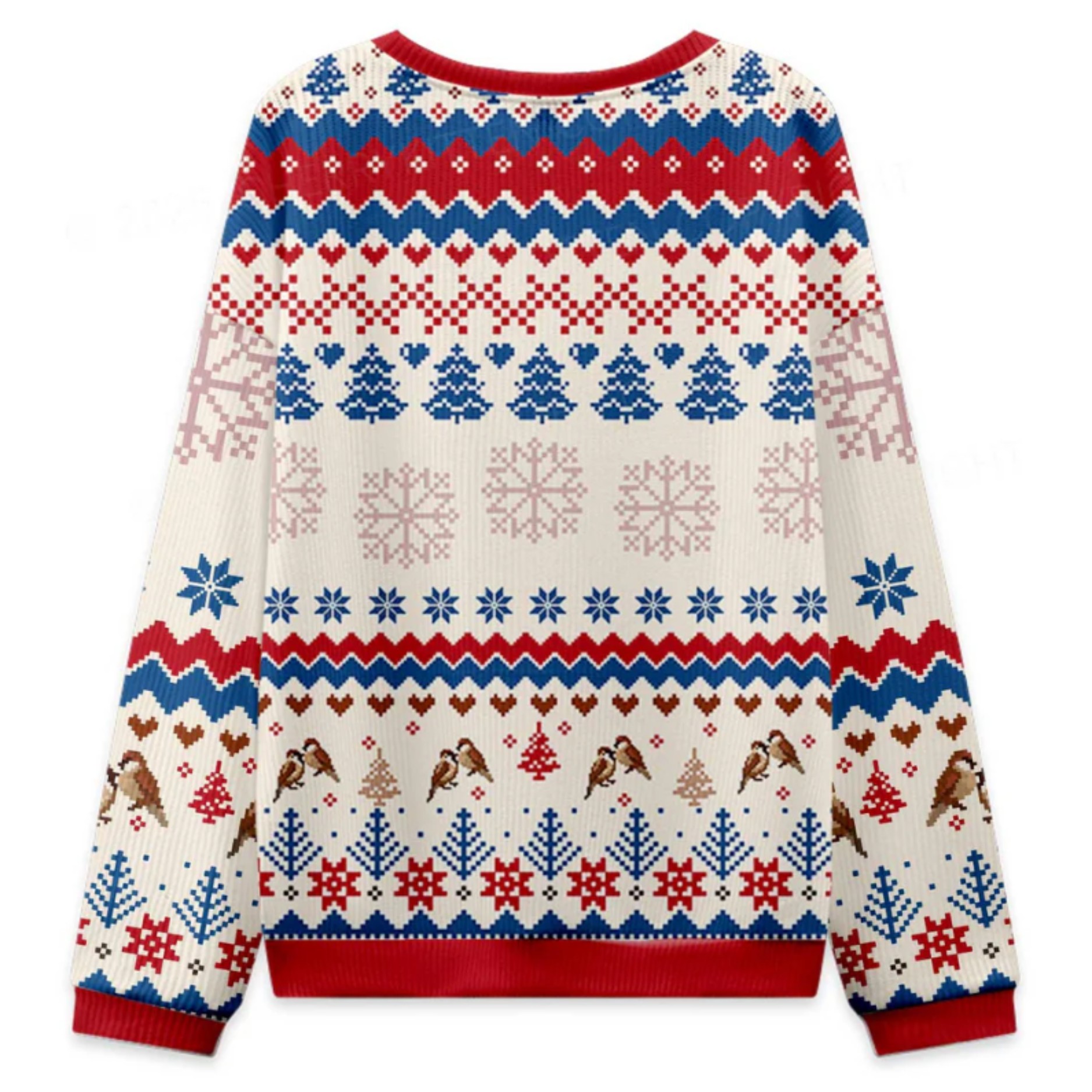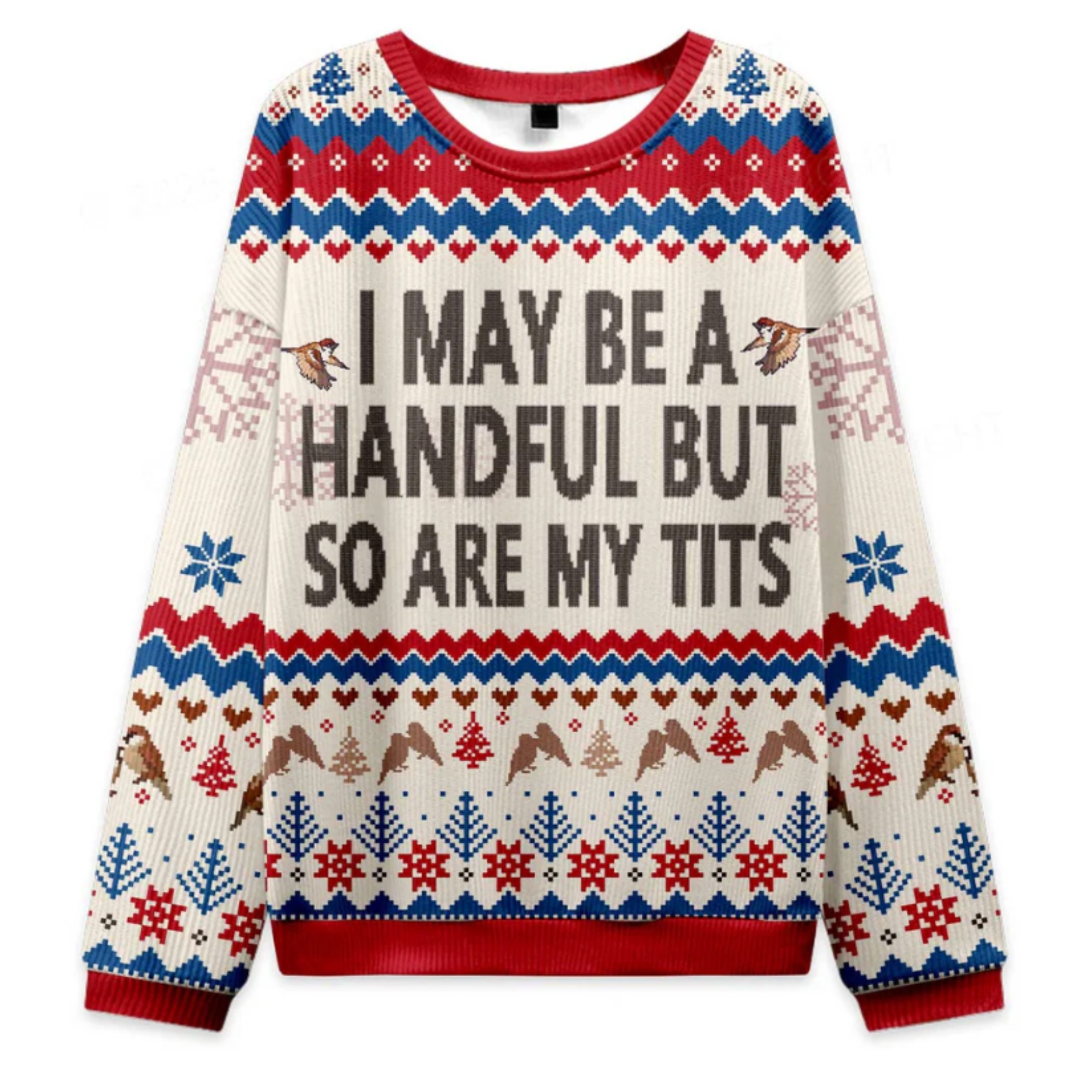 The center of the design features the bold, unmistakable phrase: “I MAY BE A HANDFUL BUT SO ARE MY TITS”. The rest of the sweater boasts a traditional, charming fair isle pattern in festive red, white, and blue, decorated with cute little birds, snowflakes, and Christmas trees. This perfect blend of sweet holiday tradition and sassy modern humor ensures you’ll be the center of attention. Crafted from soft, durable polyester, this sweater offers comfortable warmth without the itchiness of traditional wool, making it ideal for those long, spirited holiday parties.