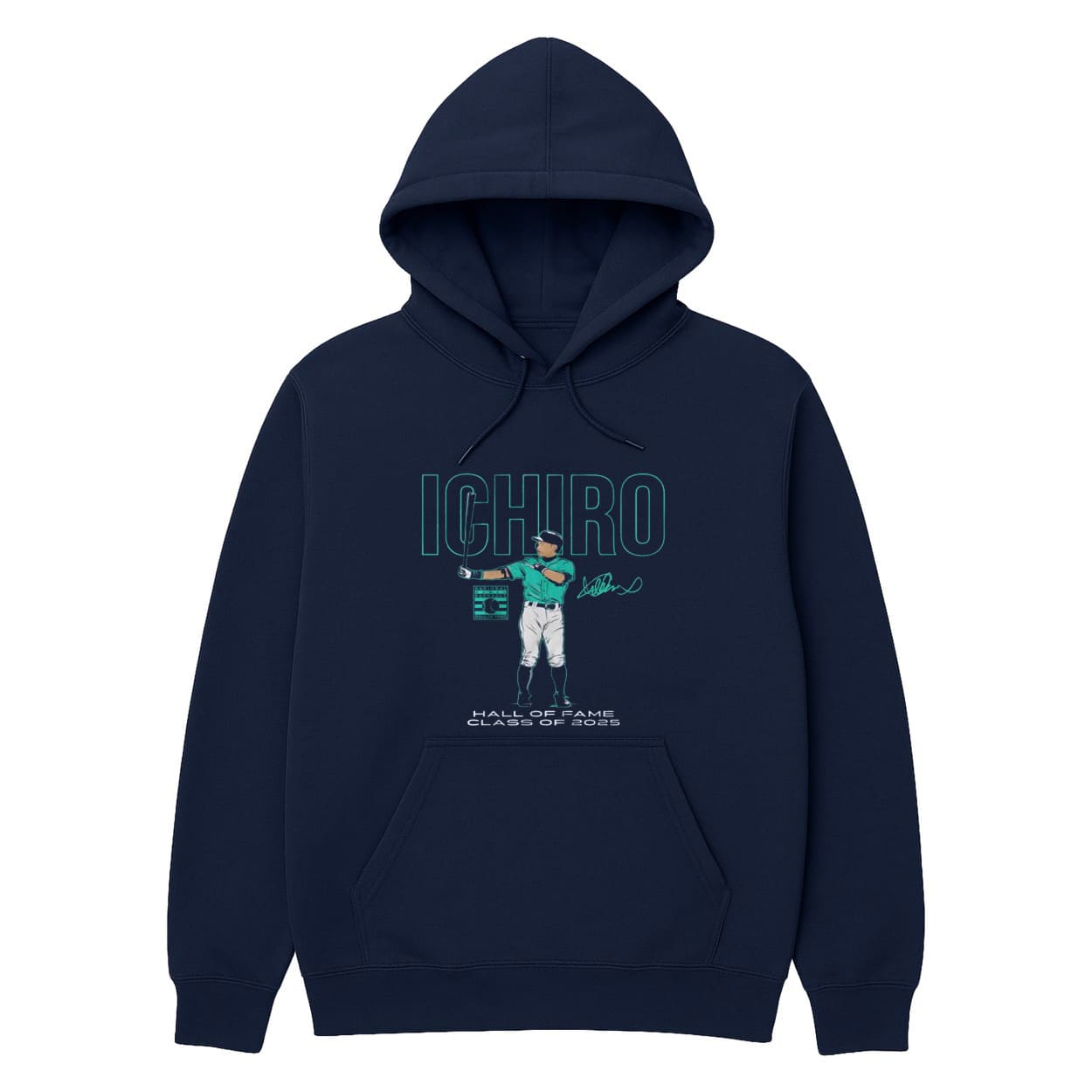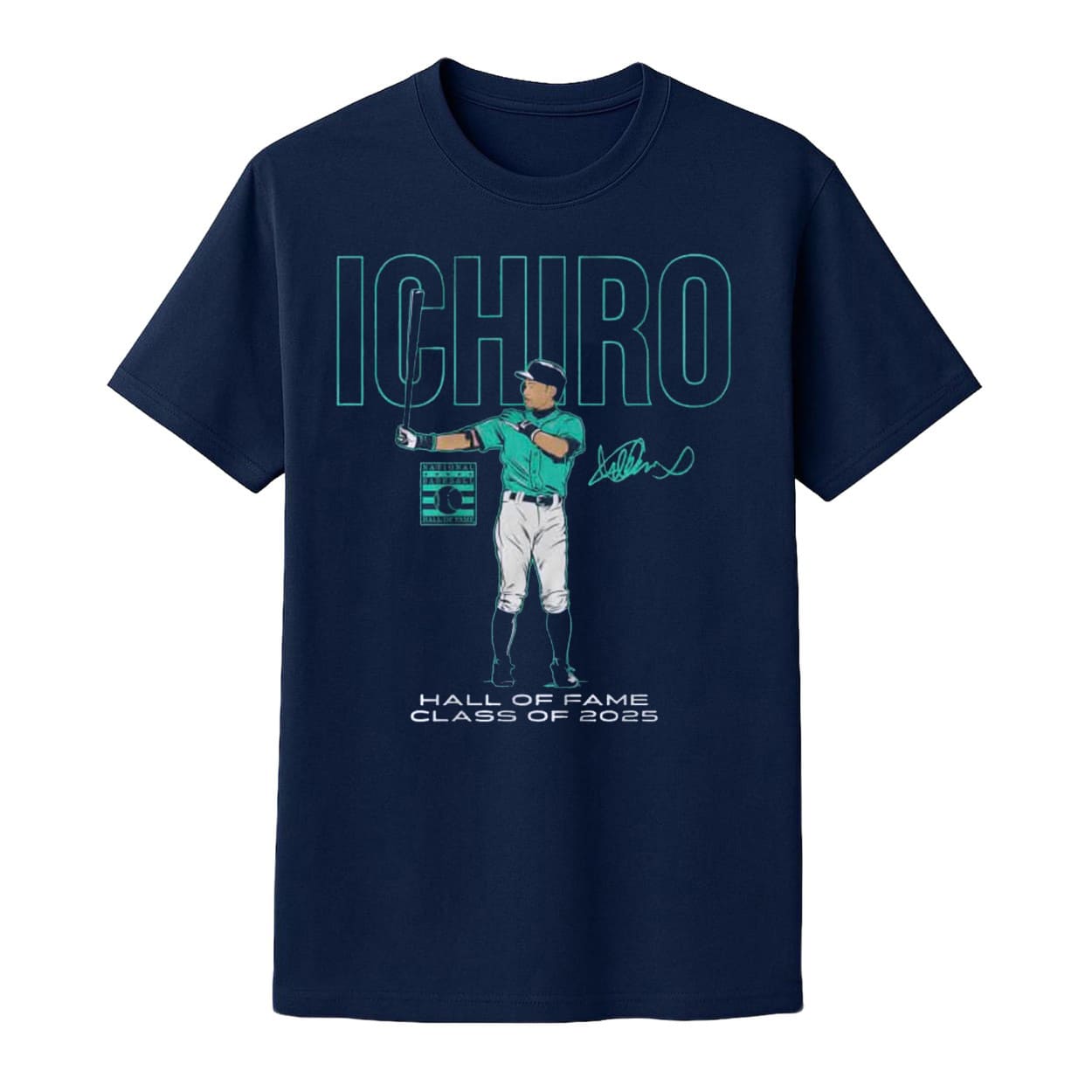 Honor Ichiro with 2025 HOF Shirt! Navy design, teal text, S-5XL, cotton-poly. Order now!
