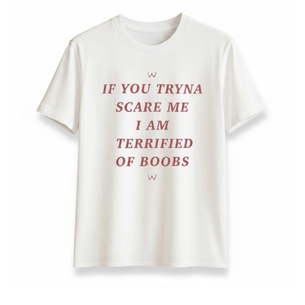 The design is intentionally minimalist to let the text do the talking: it features the full phrase, “IF YOU TRYNA SCARE ME I AM TERRIFIED OF BOOBS,” printed in a simple, impactful font across the center of the chest. The classic white shirt color with the maroon text ensures the message is clear and prominent.