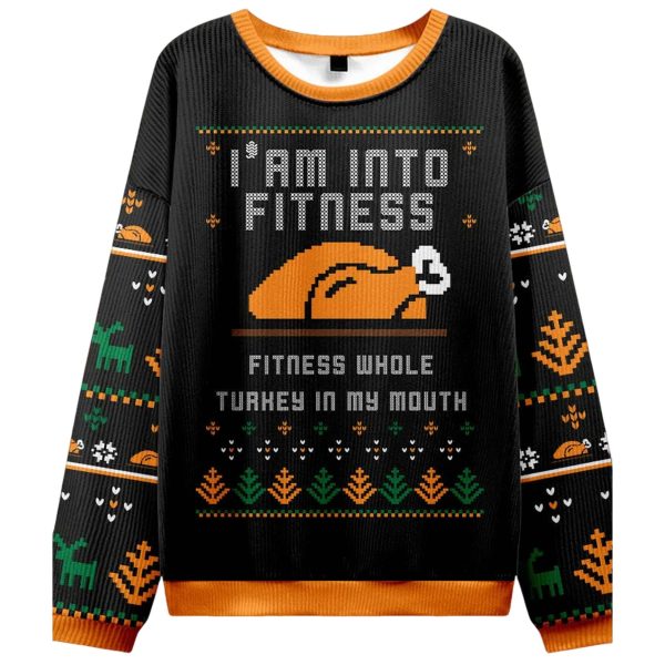 | Design Feature | Full-coverage “ugly sweater” print featuring a pixelated roasted turkey graphic and the funny “I’M INTO FITNESS” slogan. |