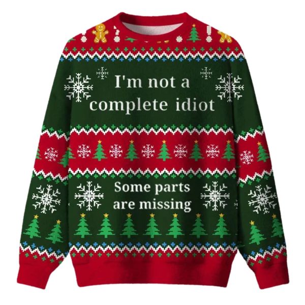 - The Confession: The central message is split by a festive border: “I’m not a complete idiot” (above) and “Some parts are missing” (below), offering the ultimate humorous excuse for any holiday blunder.