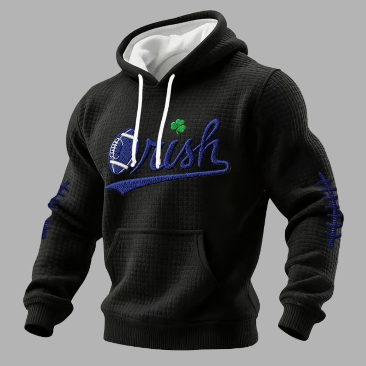 This pullover features a bold, navy blue graphic that reads “Irish” across the chest. The design is instantly recognizable, with the letter ‘I’ creatively replaced by a football, and a small, vibrant shamrock resting atop the letter ‘s’ for an extra touch of luck. The sleeves are accented with unique, navy football graphics, adding an extra layer of gridiron style. Constructed from soft, textured waffle fabric, this hoodie is designed to provide optimal warmth and breathability without feeling bulky. It includes a classic adjustable drawstring hood and a practical kangaroo pocket for ultimate convenience. Available in an extensive range of sizes, from S to 6XL, we ensure every dedicated fan can find their ideal fit.