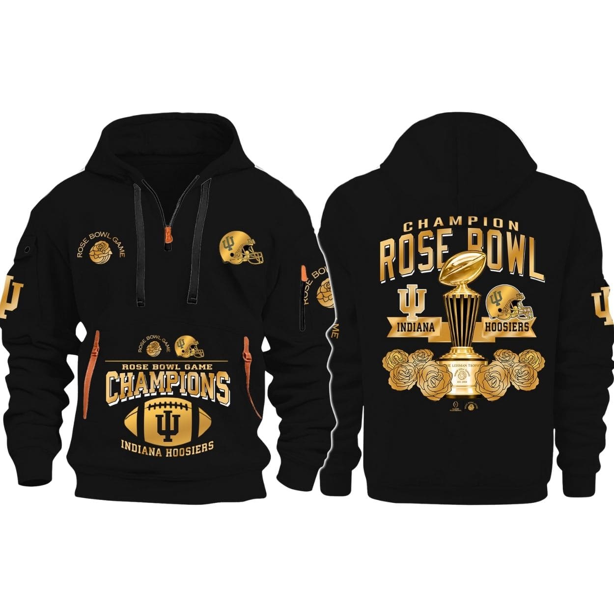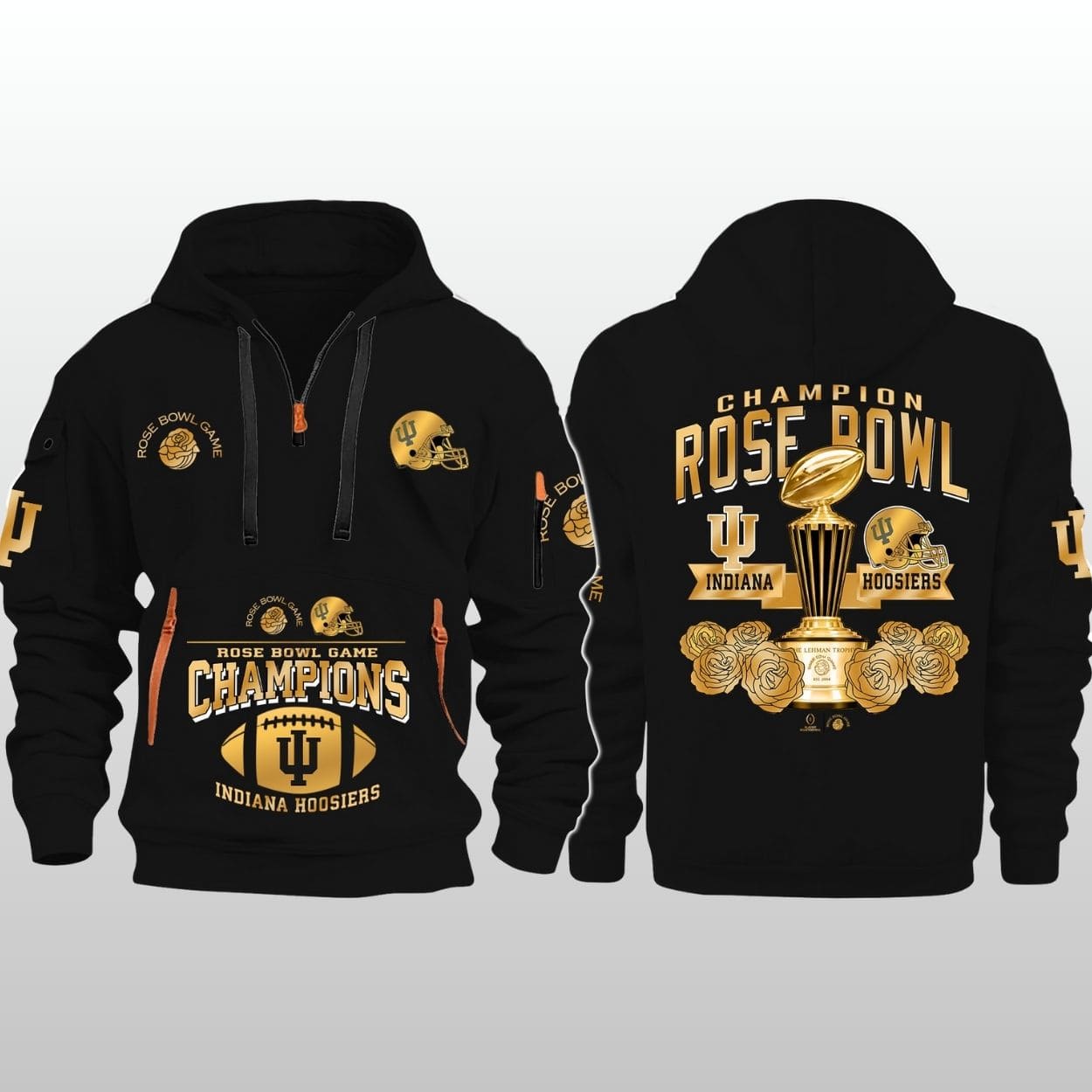Commemorate a historic victory with the IU Rose Bowl Champions 2026 Quarter Zip Hoodie. This premium piece of fan gear celebrates the Indiana Hoosiers’ incredible achievement on the grandest stage of college football. Featuring a sophisticated black and gold design, this hoodie is the ultimate way to honor the Rose Bowl Game Champions.