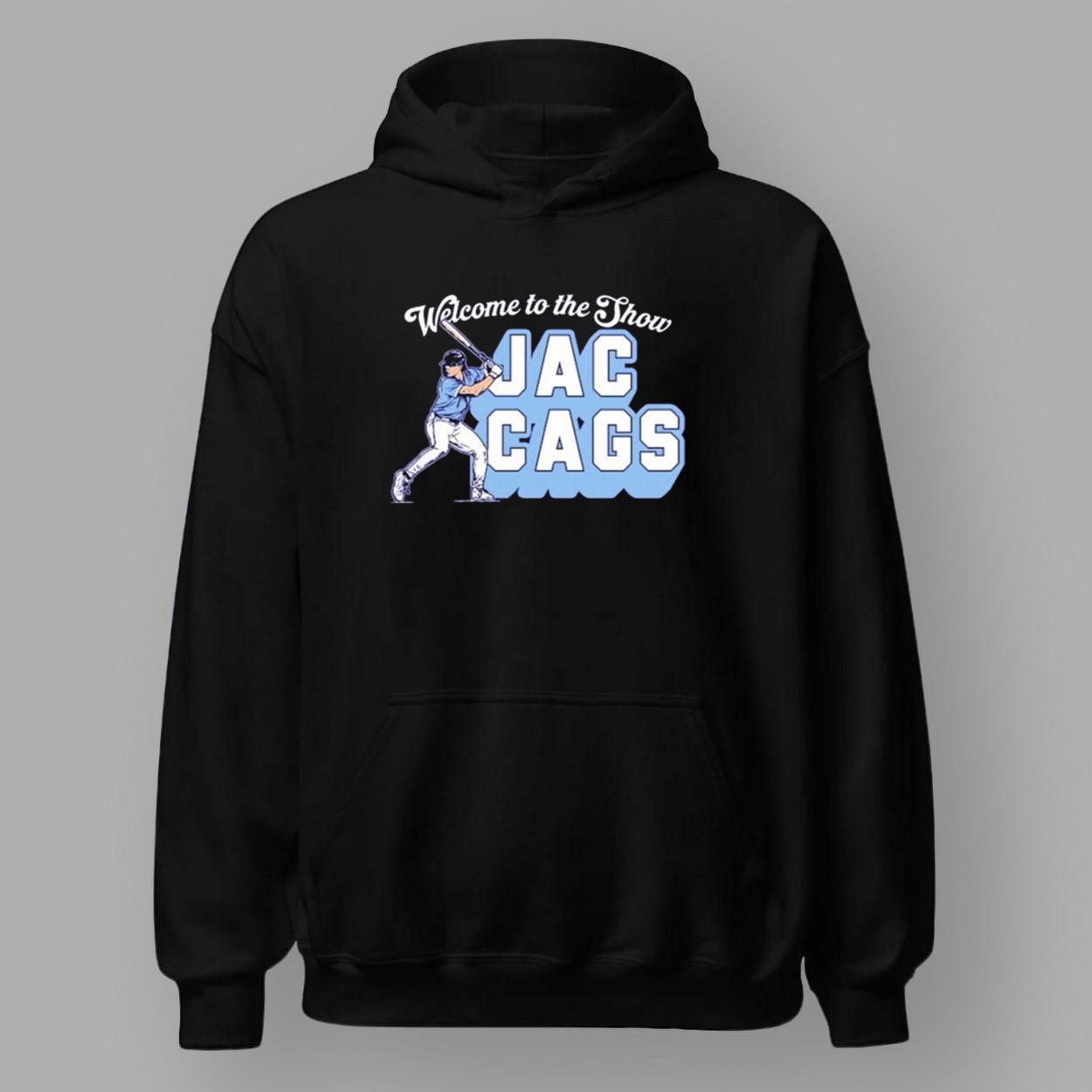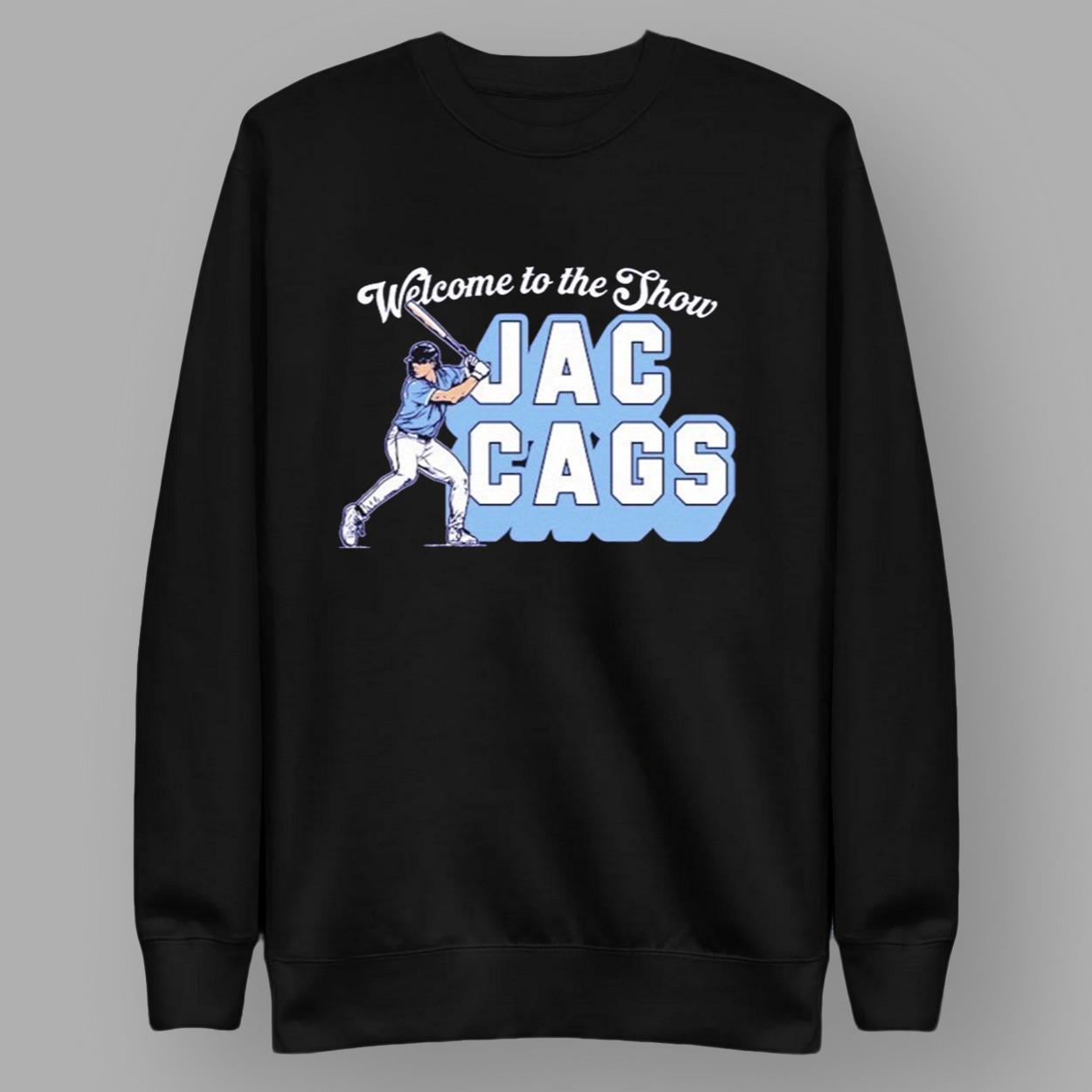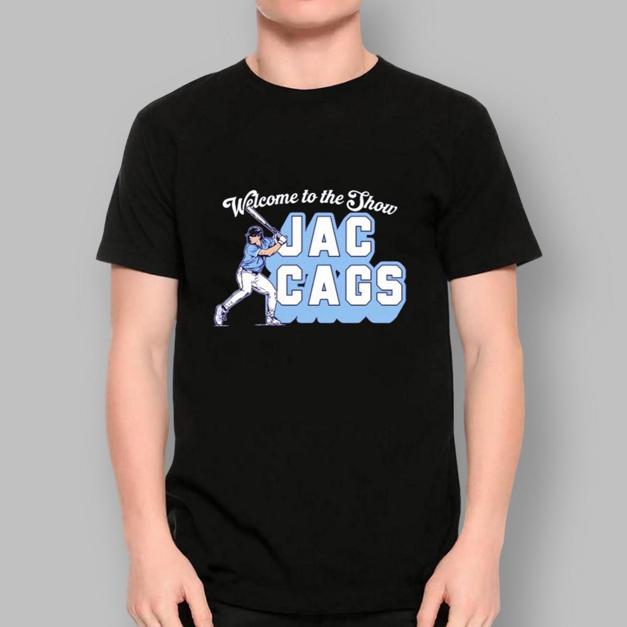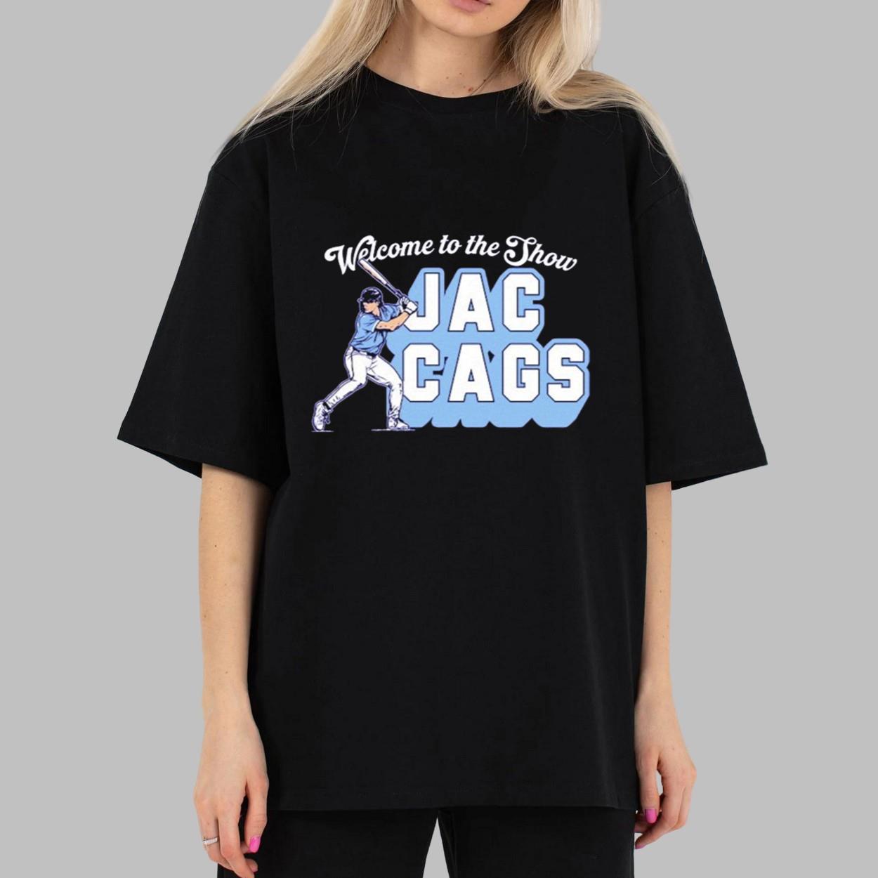 - Sporty Design: Features “Welcome to the Show JAC CAGS” with a dynamic baseball player graphic in bold white and blue on a sleek black shirt.