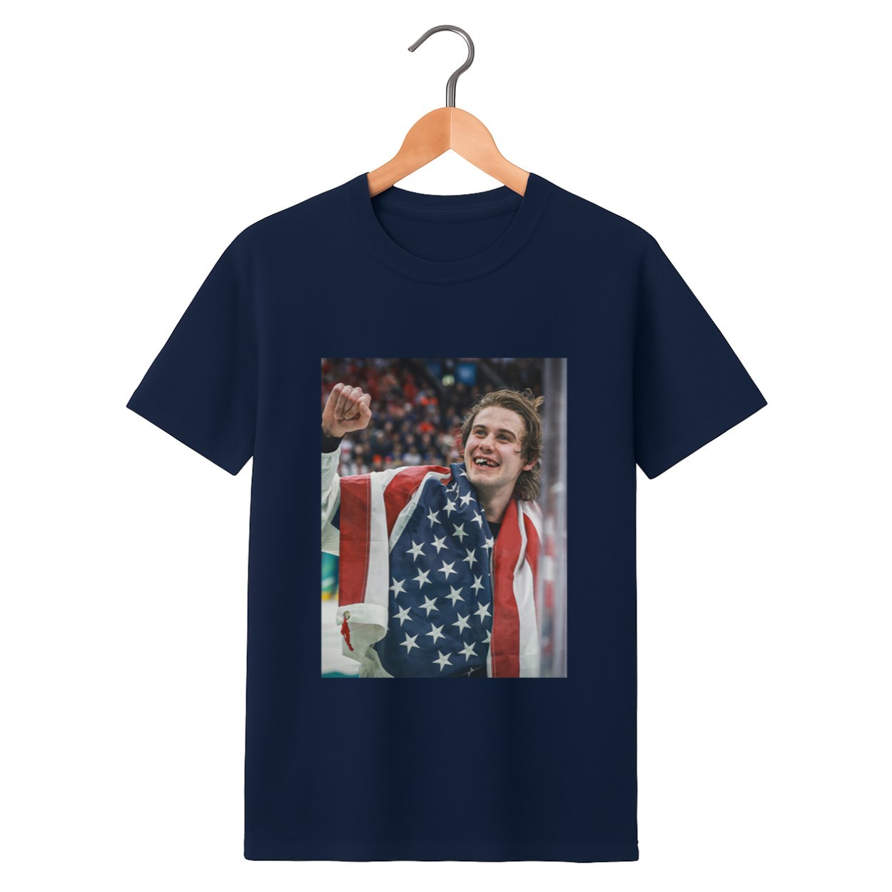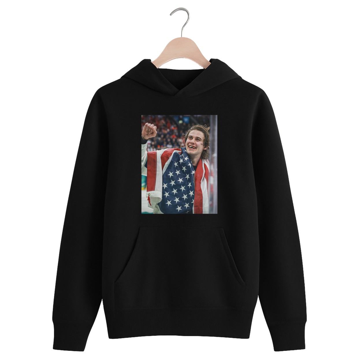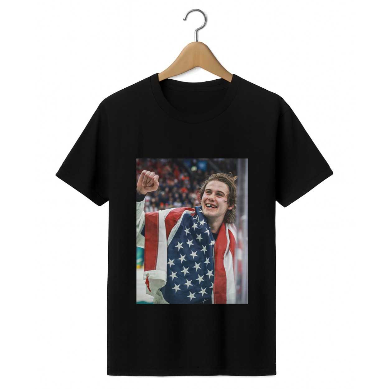 The iconic graphic features Jack Hughes draped in the American flag, raising his fist in triumph with a bloodied, toothless smile. During the gold medal clash against Team Canada on February 22, 2026, Hughes took a brutal high stick to the face. Missing his front teeth and bleeding, he refused to back down. Just 1 minute and 41 seconds into overtime, Hughes buried the game-winning goal, securing a 2-1 victory and bringing the USA its first men’s ice hockey Olympic gold since the 1980 “Miracle on Ice.”
