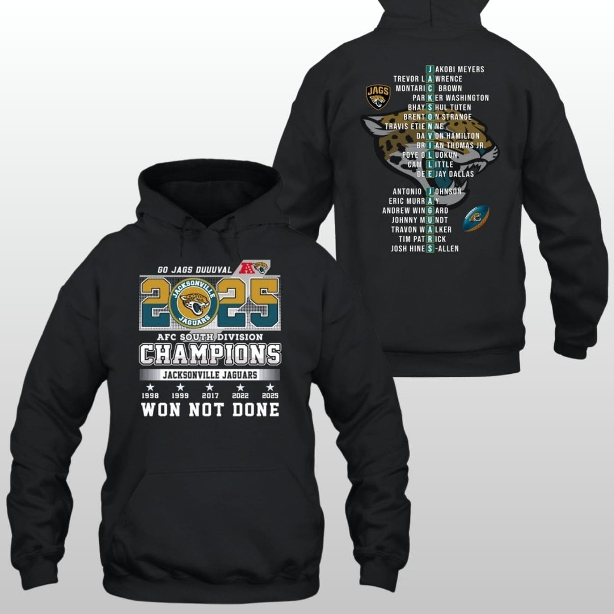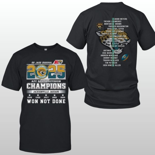 The front features a bold “2025 AFC SOUTH DIVISION CHAMPIONS” banner centered around the iconic Jaguars helmet and the “GO JAGS DUUUVAL” rally cry.