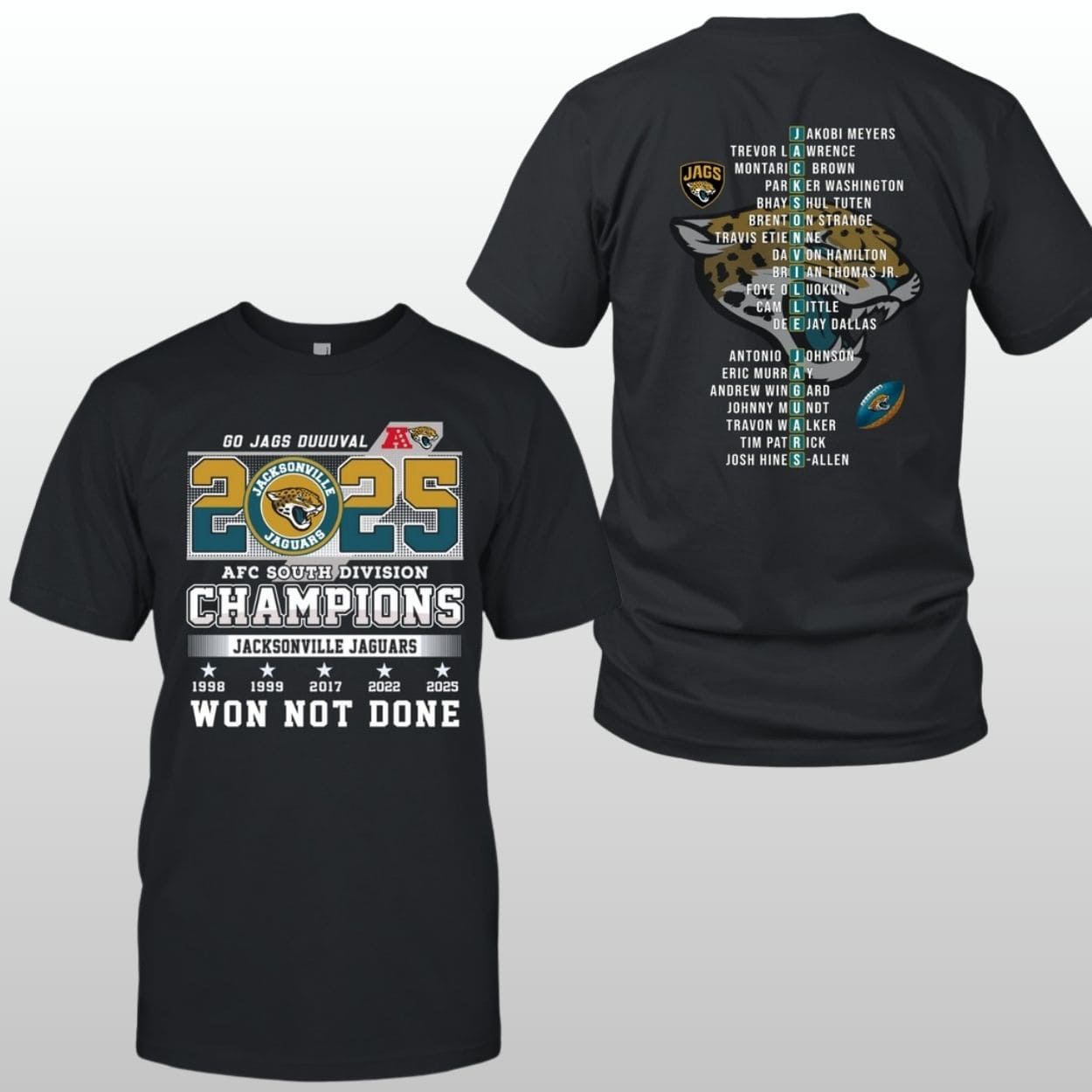 Celebrate a season of grit and absolute dominance with the Jaguars 2025 AFC South Champions Two-Sided Shirt. This premium collectible honors Jacksonville’s hard-fought journey to the top of the division, proving that the DUUUVAL spirit reigns supreme in the South. Featuring a detailed roster tribute and a historic championship timeline, this two-sided tee is the ultimate badge of honor for every member of the Jaguars faithful.
