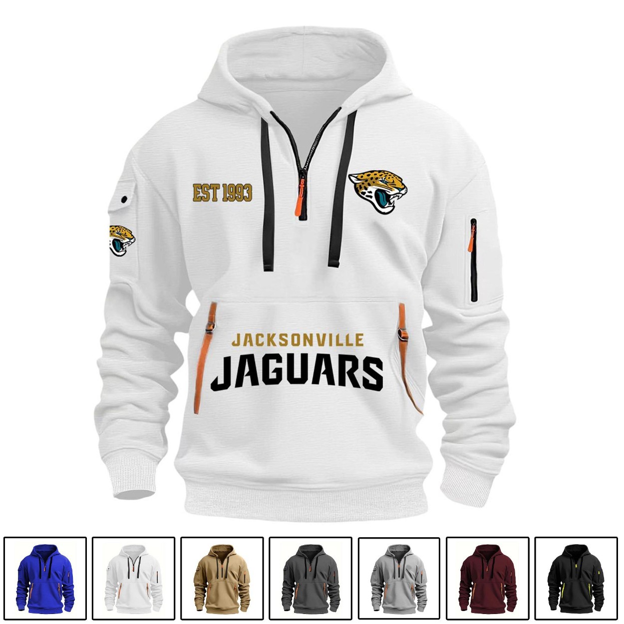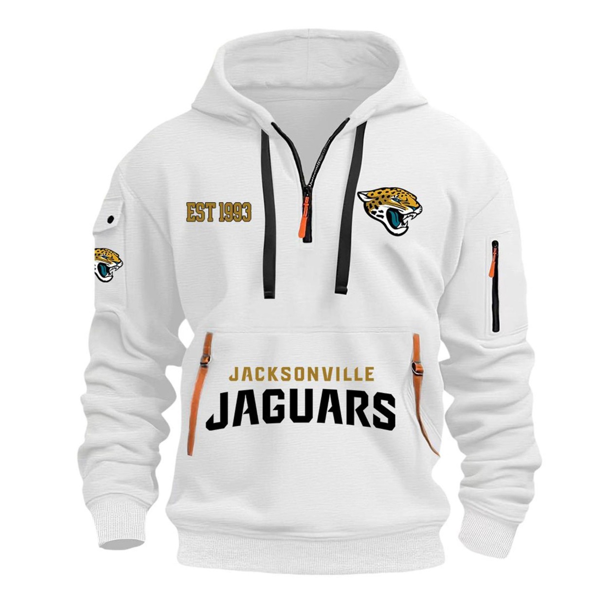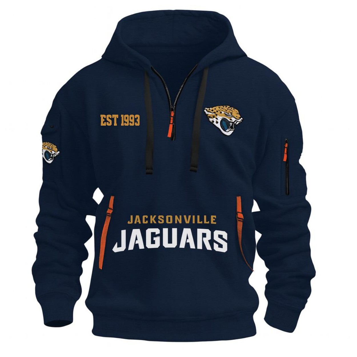 Don’t just cheer for the Jags—wear their legacy. Pick your favorite color, find your perfect fit, and secure your Jacksonville Jaguars EST 1993 Quarter-Zip Hoodie today!