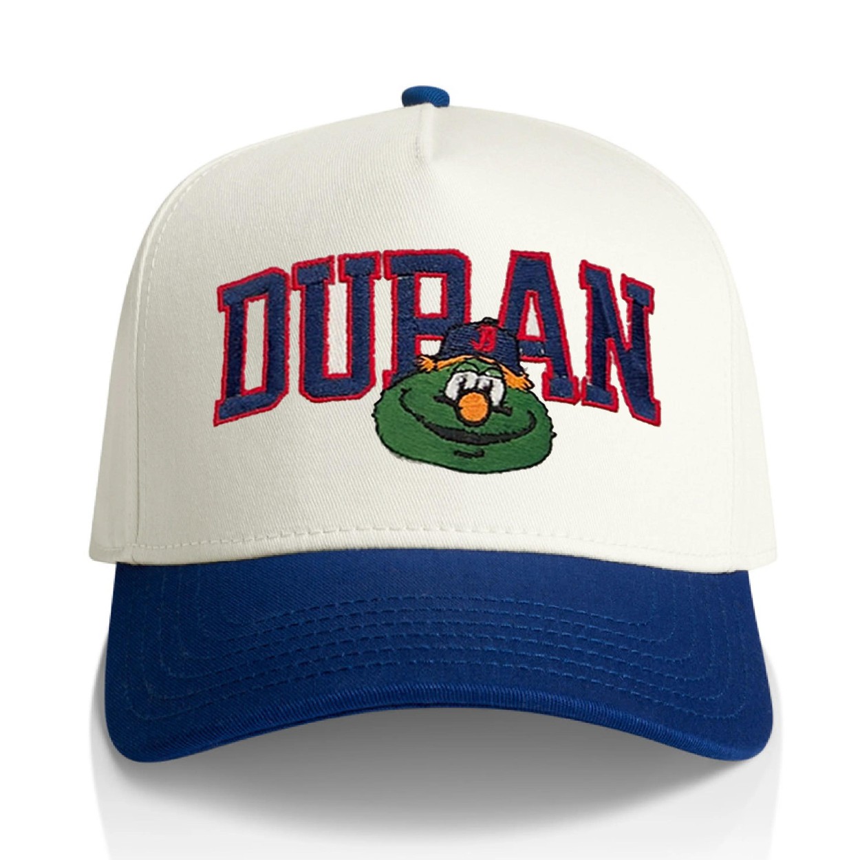 - This eye-catching cap features a crisp white crown with a bold blue brim, showcasing an embroidered “DURAN” arc and the beloved Wally The Green Monster mascot.