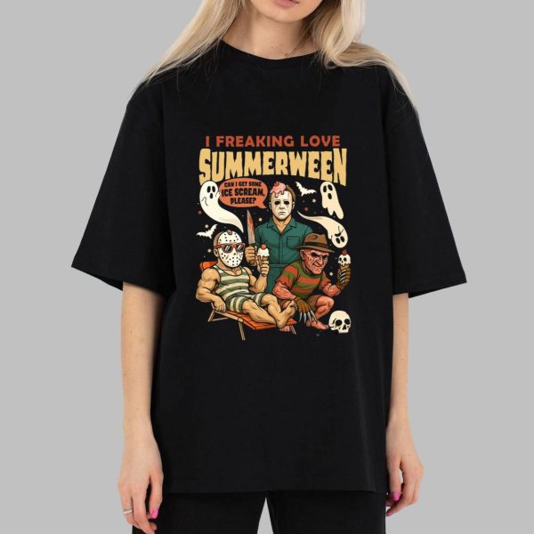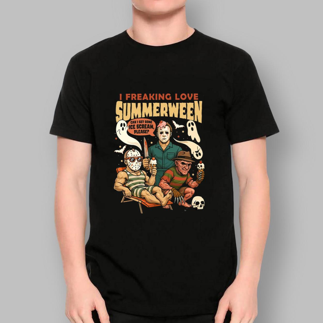Crafted from a comfortable cotton-polyester blend, this shirt offers a relaxed fit across its wide size range. The front showcases a vibrant illustration of Jason in a swimsuit, Michael with a knife, and Freddy holding ice cream, all set against a black backdrop. The bold “I FREAKING LOVE SUMMERWEEN” text in orange adds a festive touch, while ghosts and “Can I get some ice cream please?” dialogue bring humor. The short-sleeve, crew-neck style ensures all-day comfort with a high-quality print.