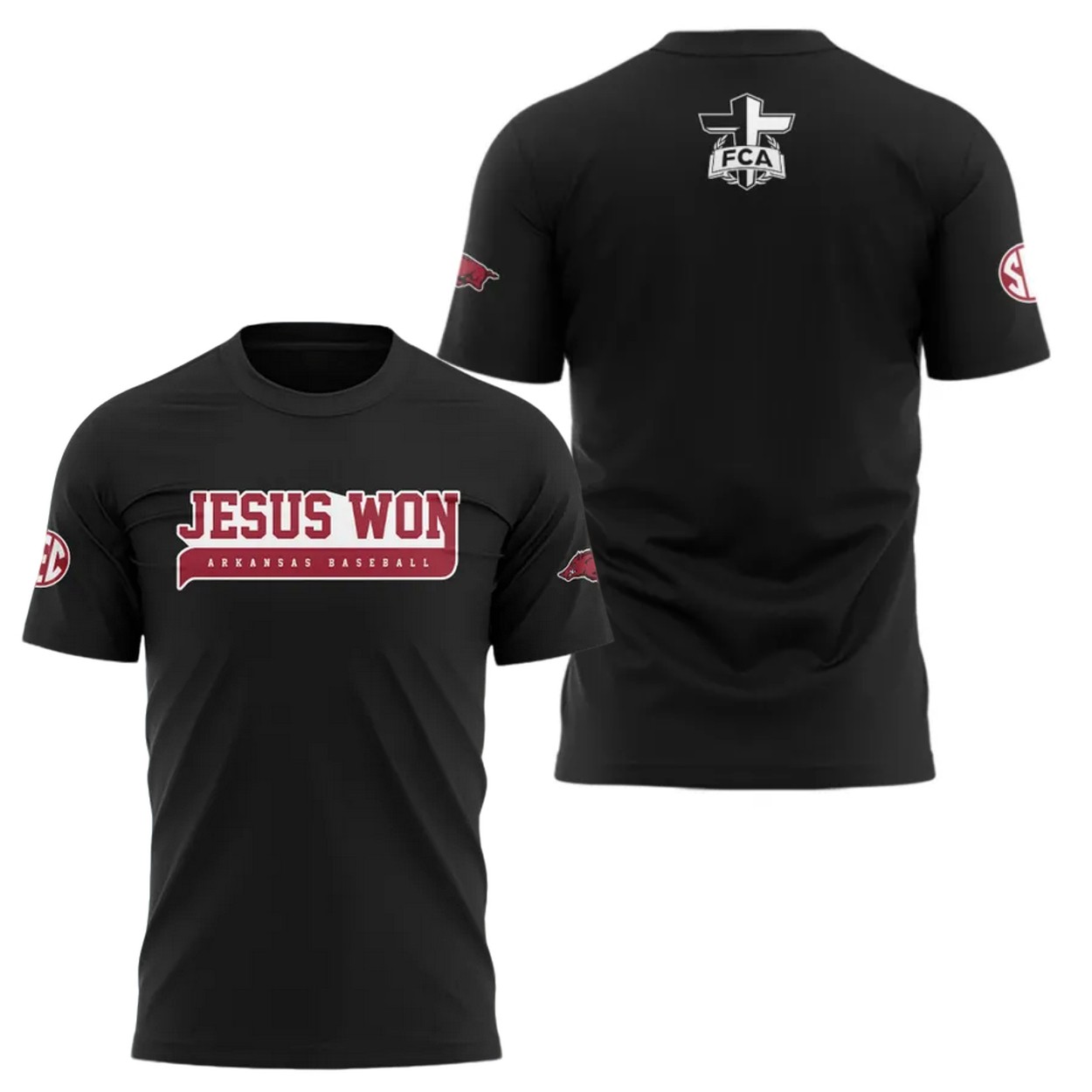 The shirt features bold “JESUS WON” text in white with a red outline across the chest, paired with “Arkansas Baseball” in a dynamic script below. The Razorbacks logo adorns the sleeves, while the back showcases the FCA emblem with a cross, symbolizing strength and belief. Made from a soft cotton-polyester mix, it offers breathability and durability, making it a standout piece for fans of all ages.