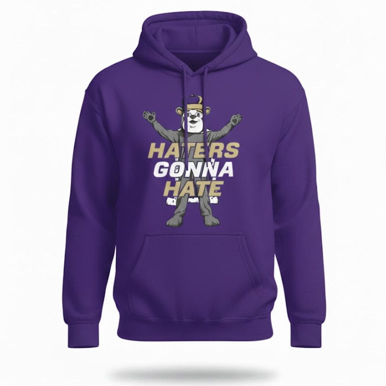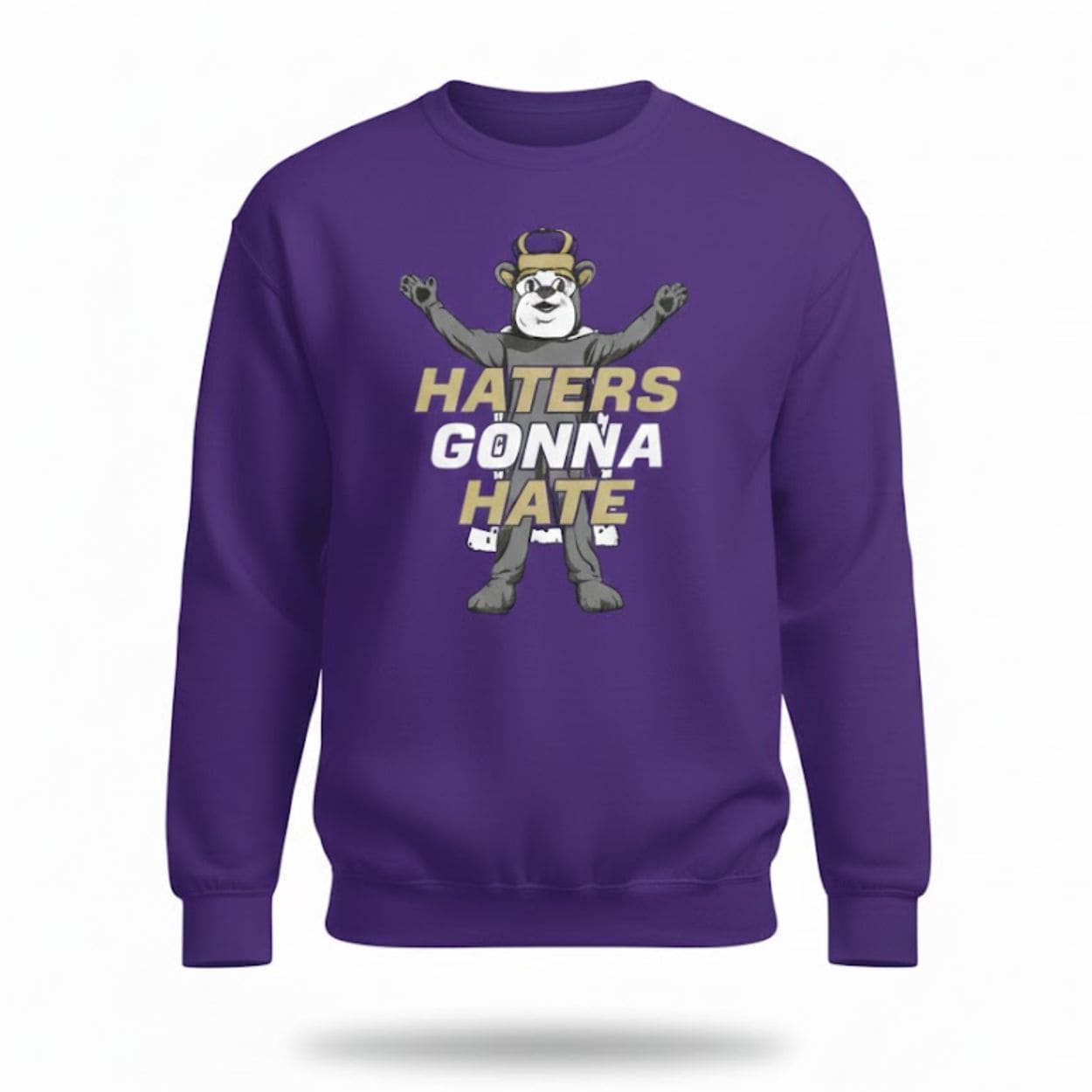 The central design features the iconic Duke Dog mascot standing tall with arms raised, surrounded by the large, gold and white text “HATERS GONNA HATE“.