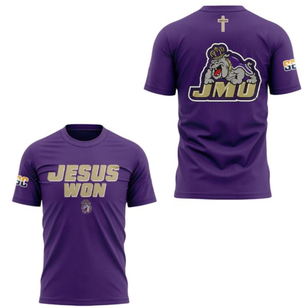 The front proudly displays the phrase “JESUS WON” in bold, striking gold lettering. The design incorporates a small graphic of the JMU Bulldog mascot.