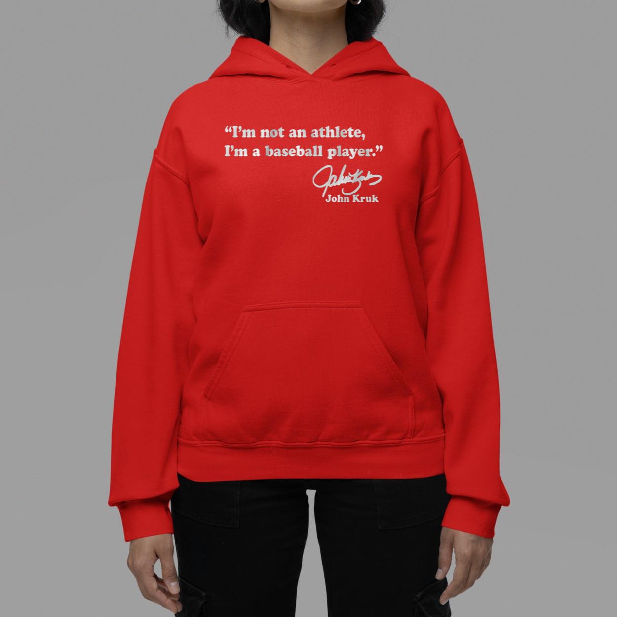 Celebrate baseball legacy with the John Kruk I’m a Baseball Player Shirt, a tribute to the iconic player’s wit and charm. Available in sizes S to 5XL, this shirt blends cotton and polyester for a soft, durable fit perfect for fans and casual wearers alike. Featuring the legendary quote “I’m not an athlete, I’m a baseball player,” paired with John Kruk’s signature, this red tee embodies his unique spirit. Ideal for game days, watch parties, or everyday wear, it’s a must-have for baseball enthusiasts.