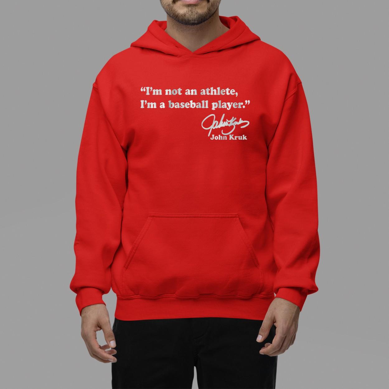 John Kruk shirt, S-5XL, cotton-poly blend. Red with quote & signature. Wash cold, dry low. Order now!