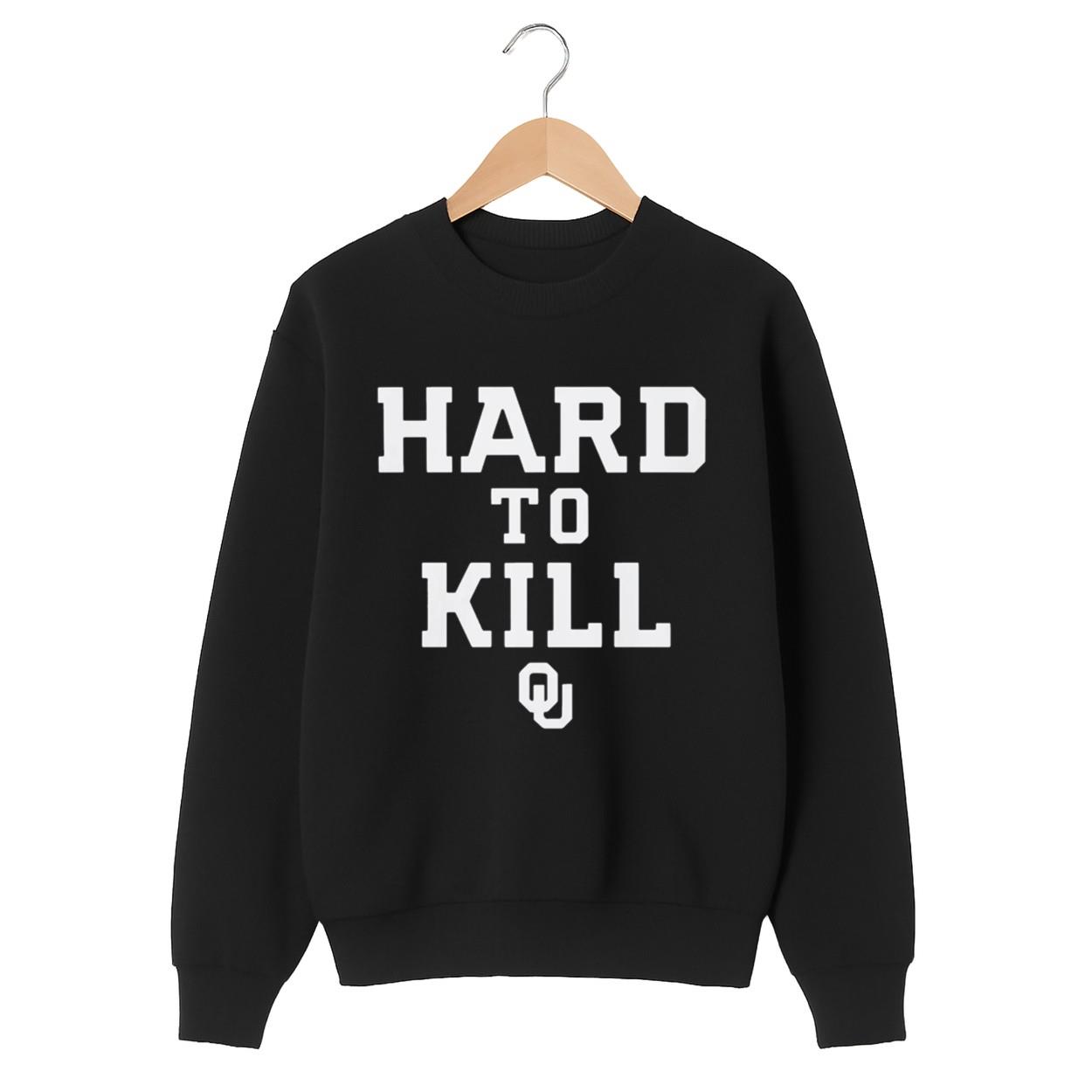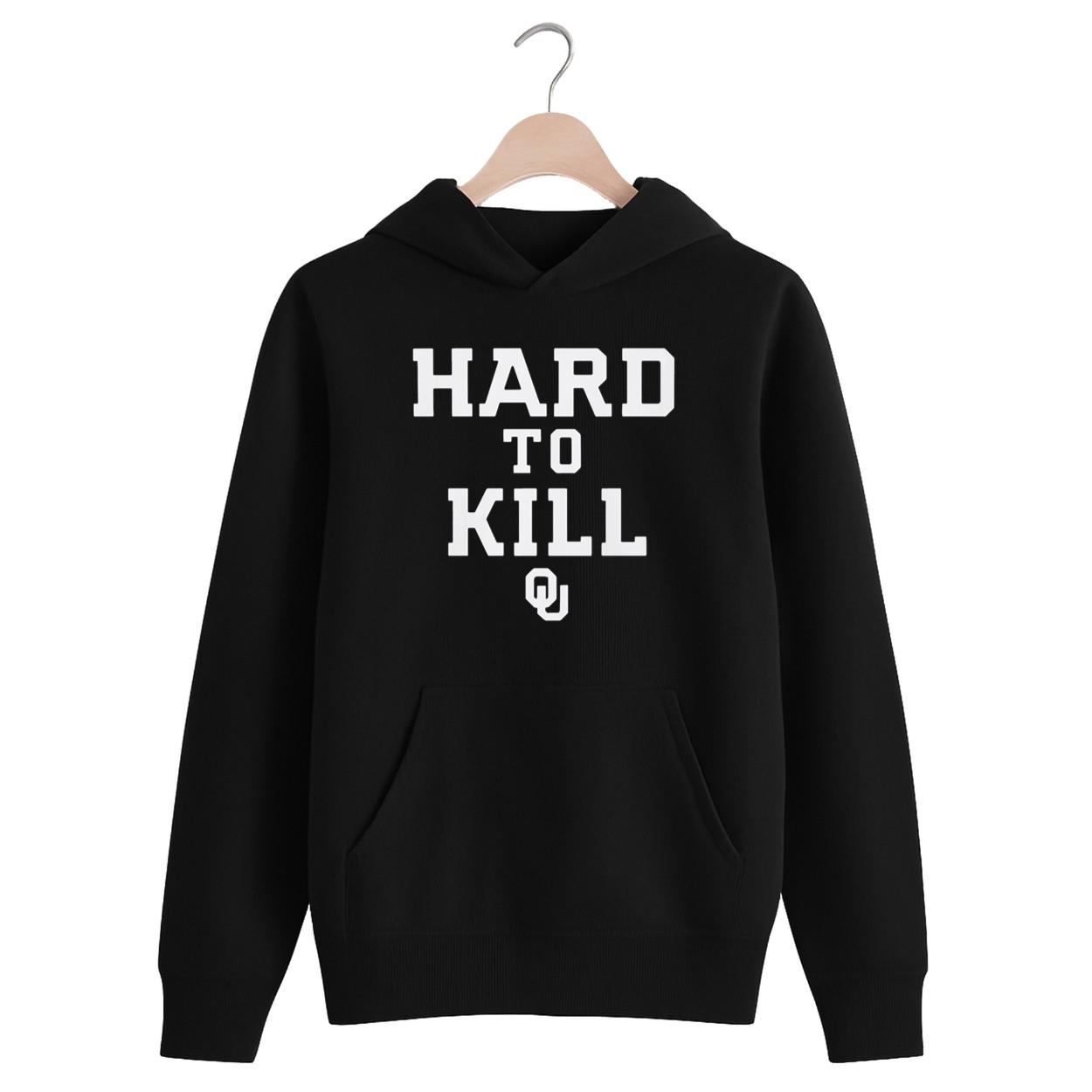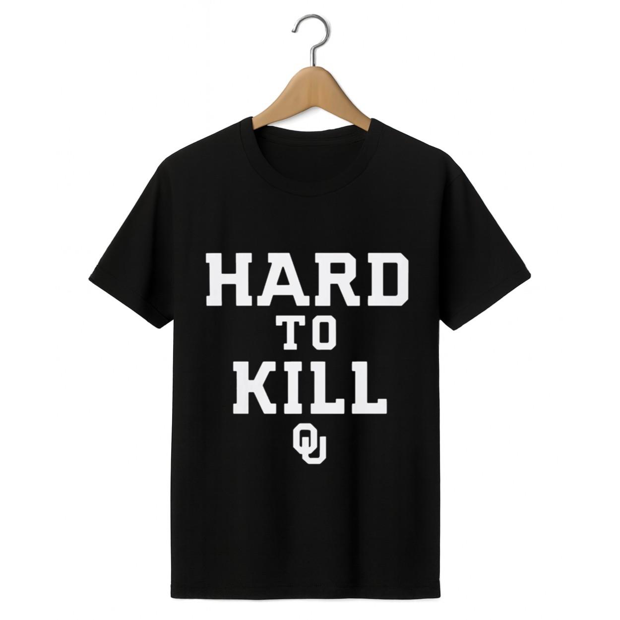 Design Details: The shirt comes in a classic, versatile Black color. The bold, impactful phrase “HARD TO KILL” is printed prominently in stark White block letters. A subtle, OU logo is placed beneath the text, signifying your allegiance to the University of Oklahoma.