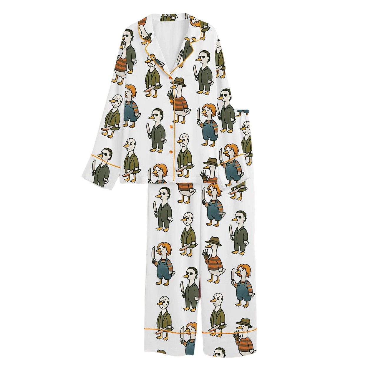 Spooky Halloween 2025 pajama set! Geese as horror icons on satin polyester-spandex. Sizes XS-4XL. Order now!