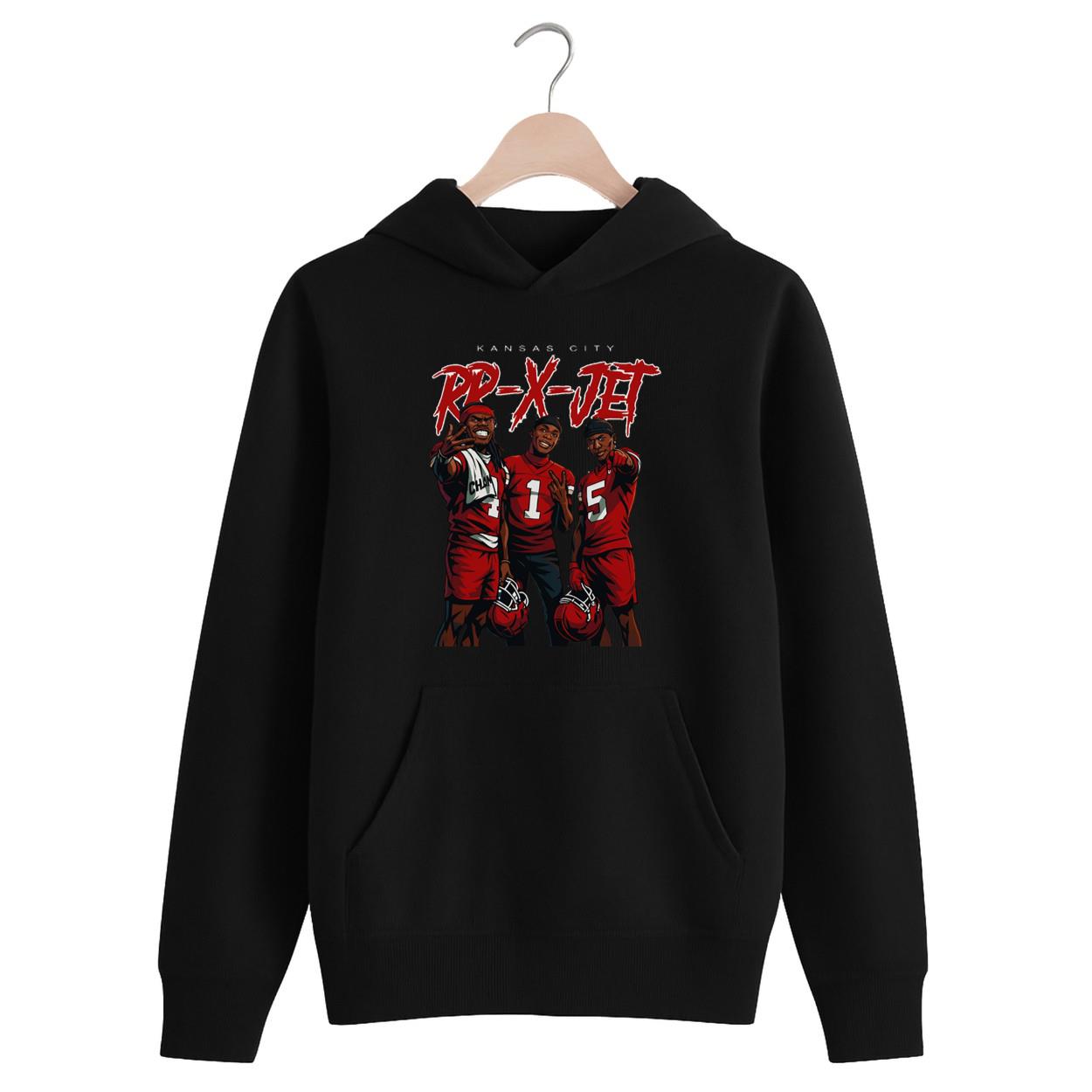 | Design Feature | Single-sided graphic featuring a stylized image of the three Chiefs receivers and the bold “RR-X-JET” slogan. |