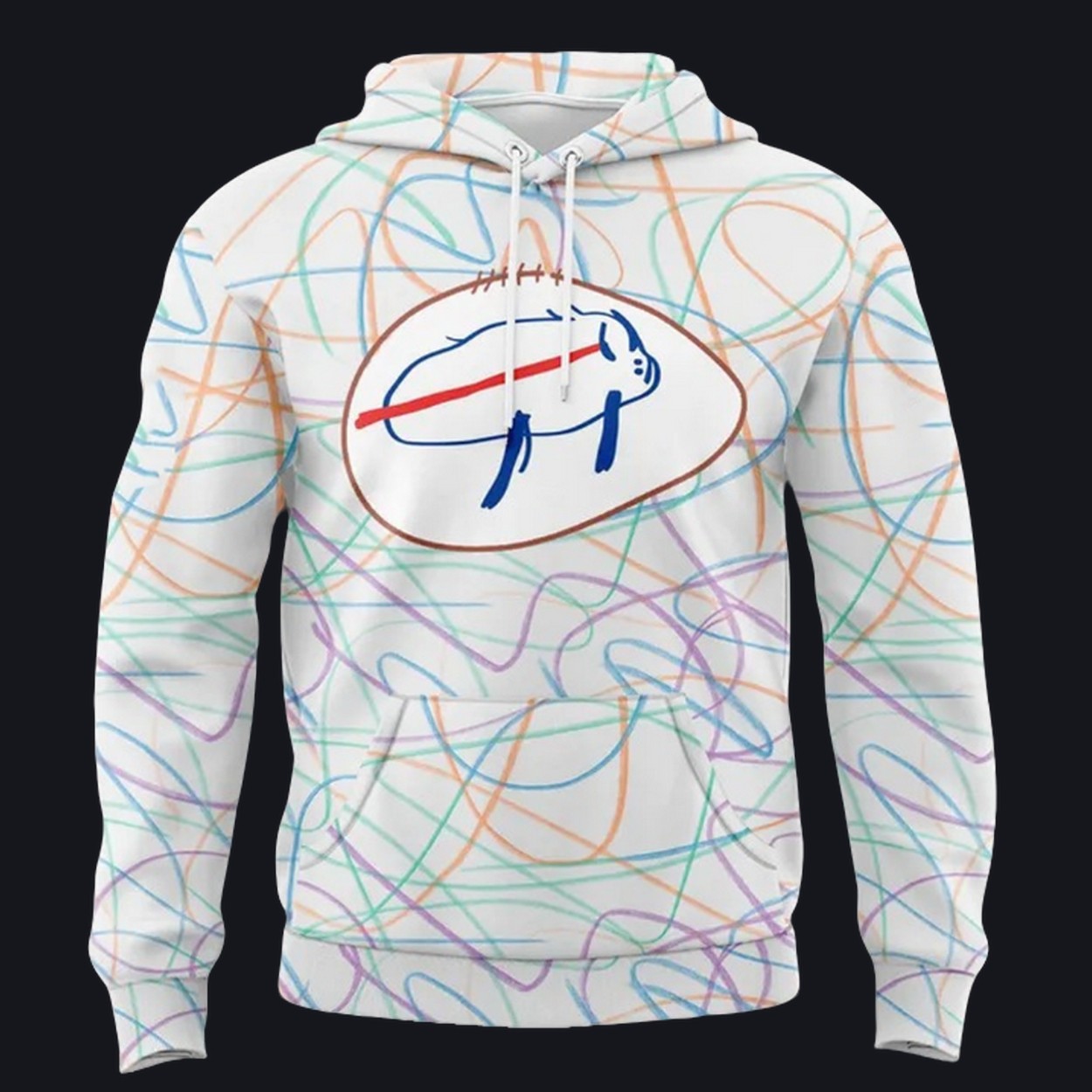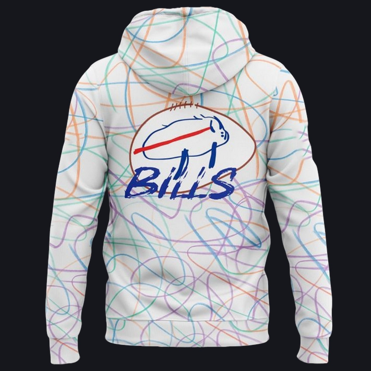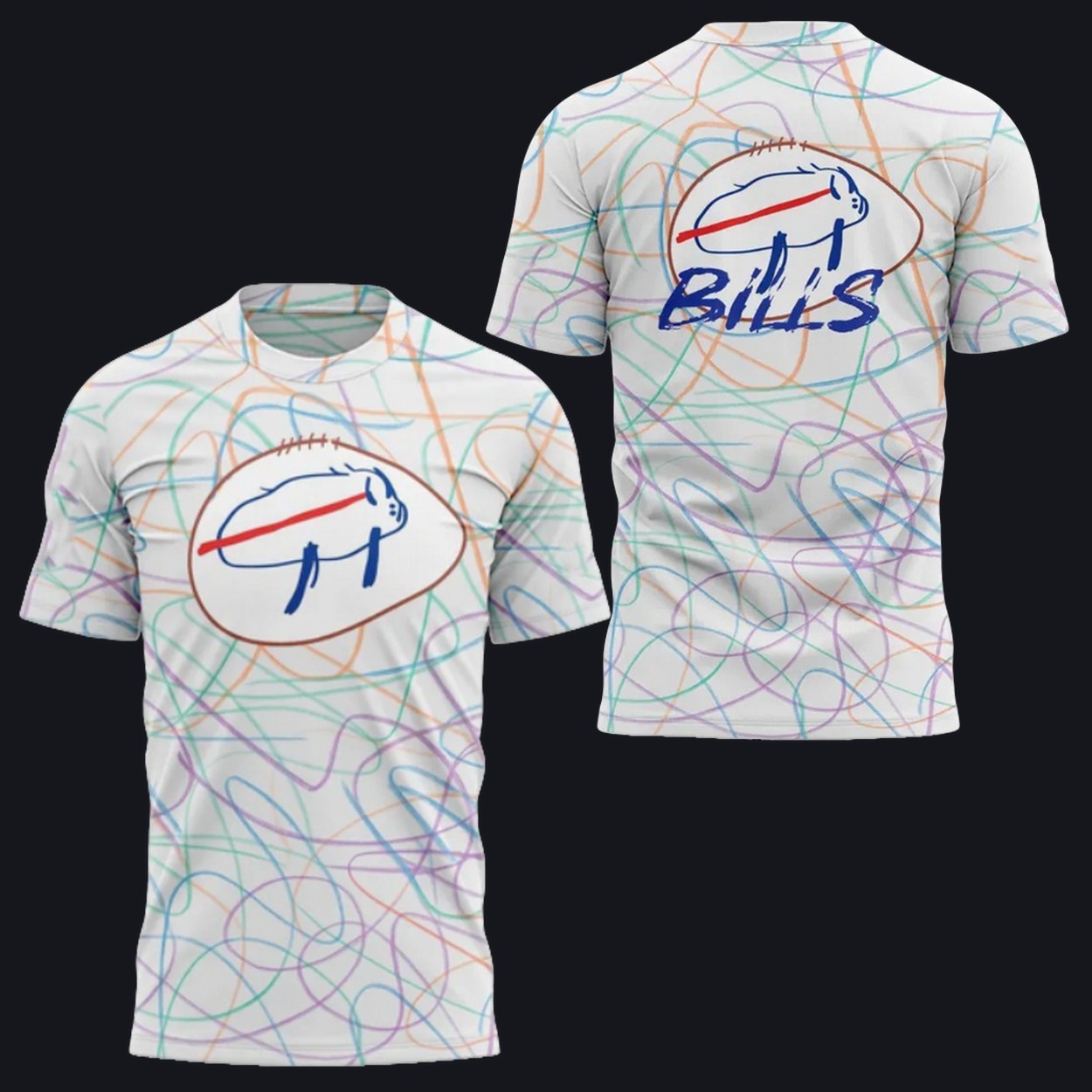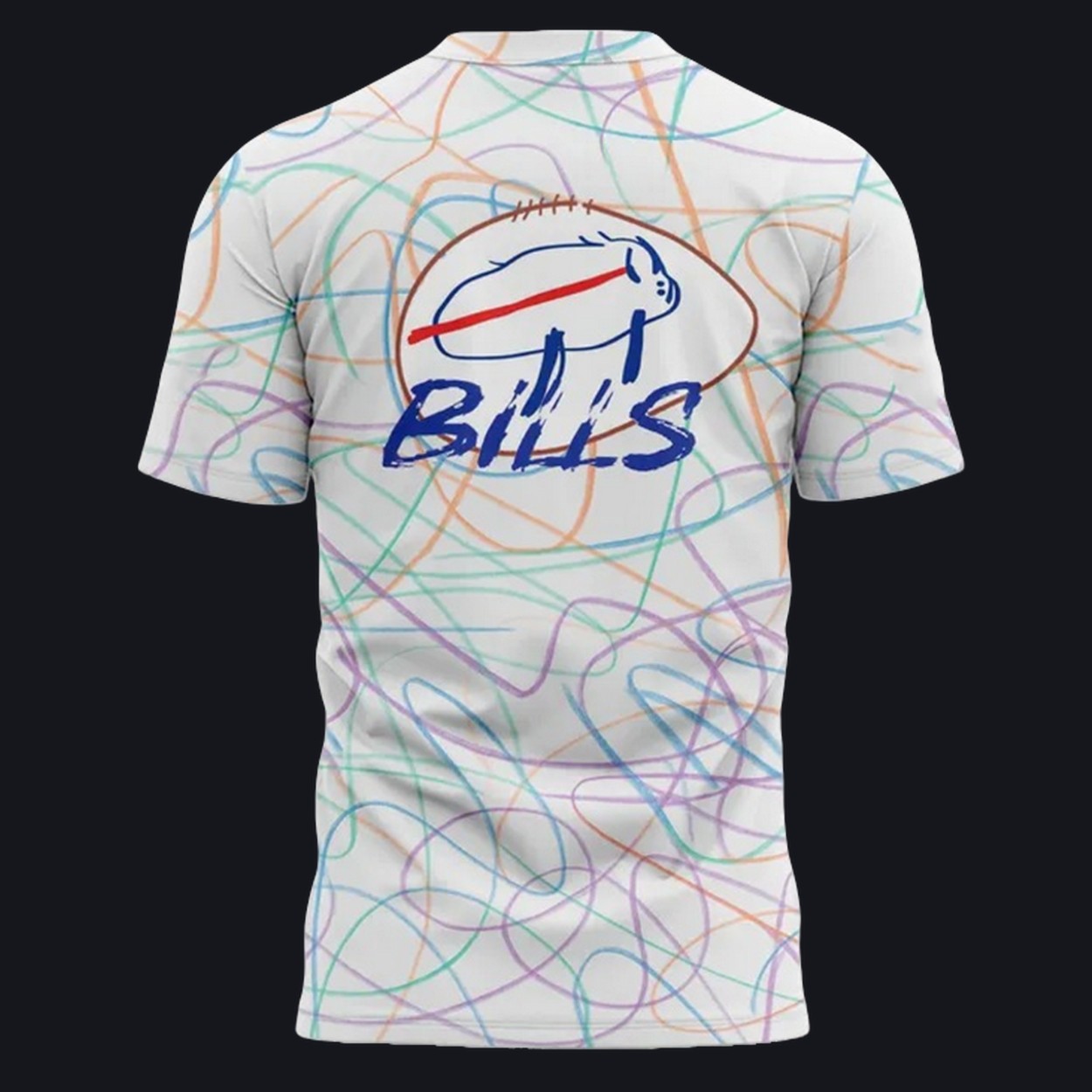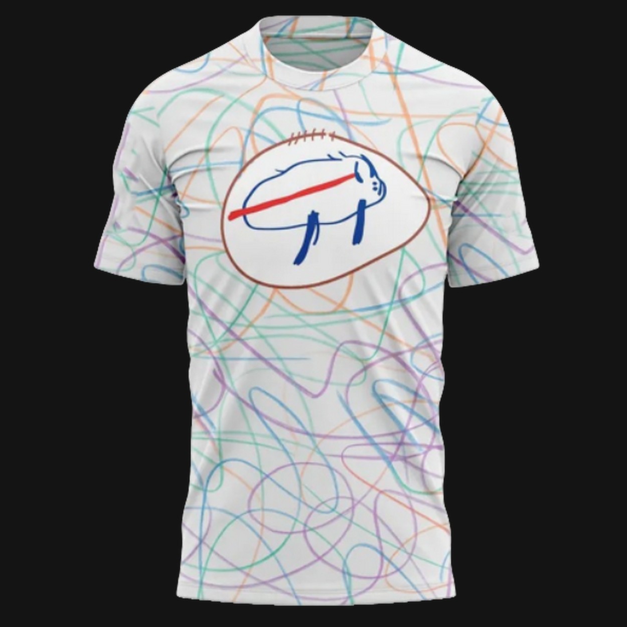 Design: The shirt features a creative, multi-colored design inspired by the children’s artwork, combined with the Bills logo, celebrating the spirit of both the team and the hospital’s young patients.