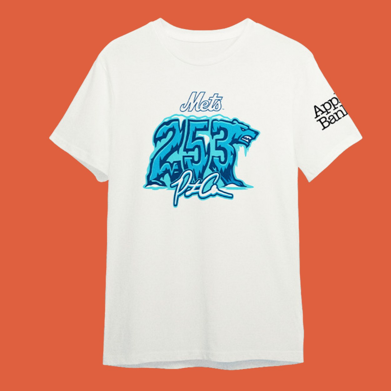 - This white tee boasts a vibrant design featuring the Mets logo, the number 253, and a fierce polar bear graphic in icy blue tones, symbolizing Alonso’s “Polar Bear” nickname.