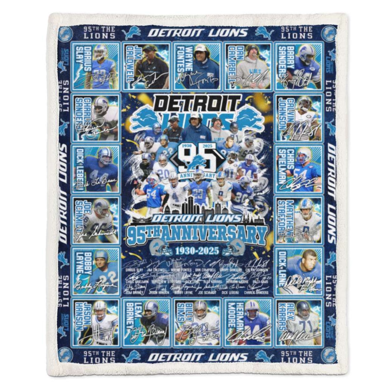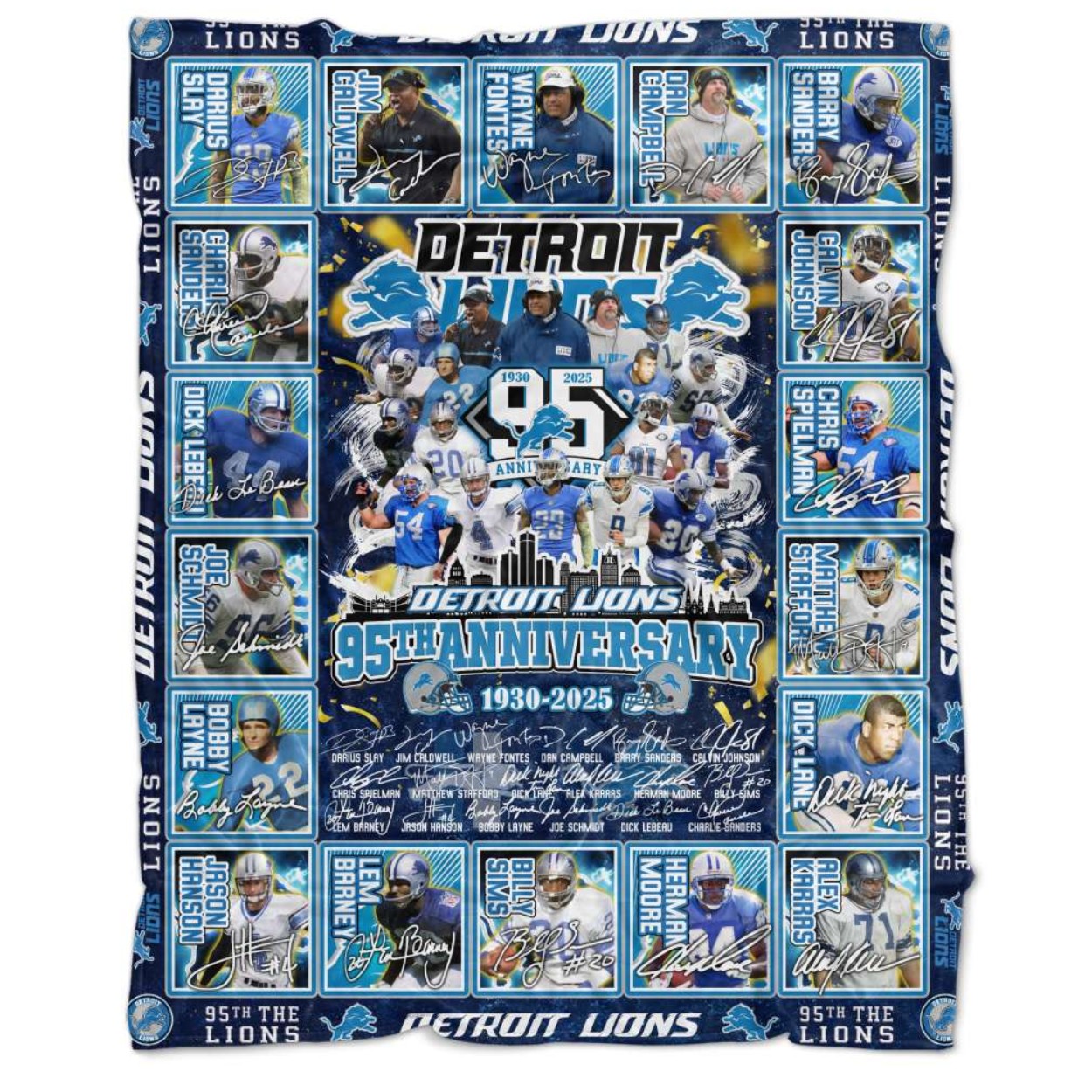 - This blanket features a stunning collection of iconic players, including legends like Barry Sanders, Calvin Johnson, and Joe Schmidt, all captured in dynamic action shots. It showcases the team’s remarkable journey from 1930 to 2025, making it a perfect collectible for any true Lions fan.