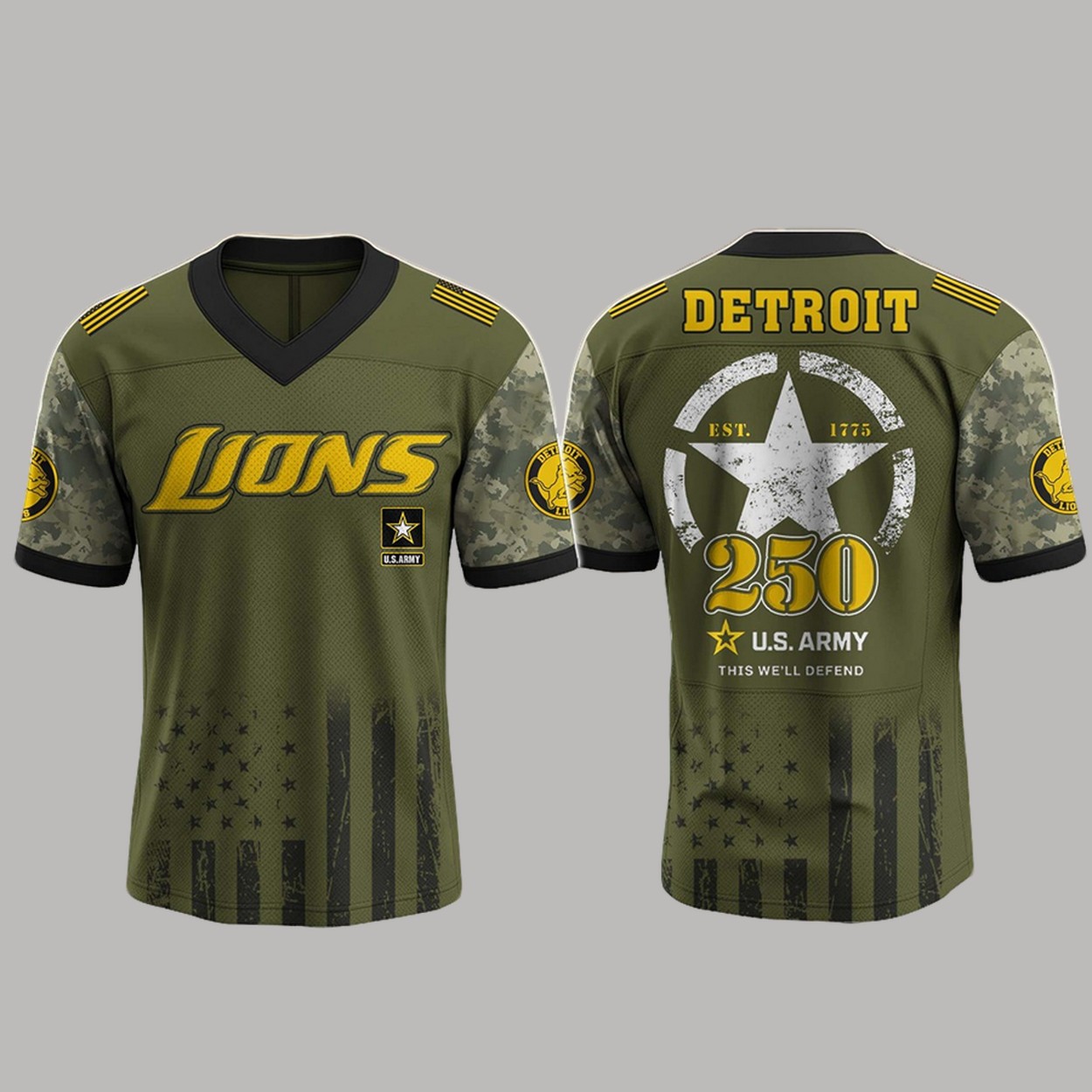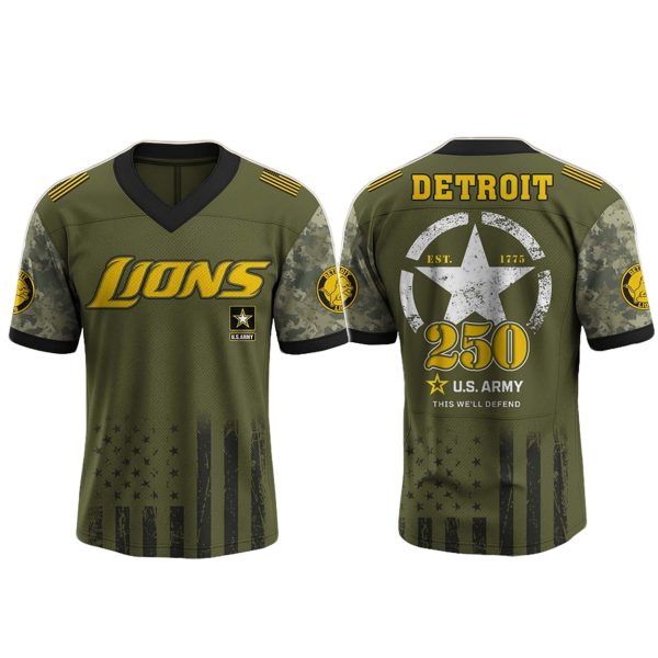 Commemorate the Detroit Lions and the U.S. Army’s 250th anniversary with the “Lions x US ARMY 250th Birthday Jersey.” Available in sizes XS to 4XL, this jersey is crafted from a breathable polyester blend for superior comfort and durability. The design features a striking camouflage pattern, the Lions logo, and “250” with a star emblem, complemented by “EST. 1775” and “This We’ll Defend” on the back, blending team loyalty with military tribute.