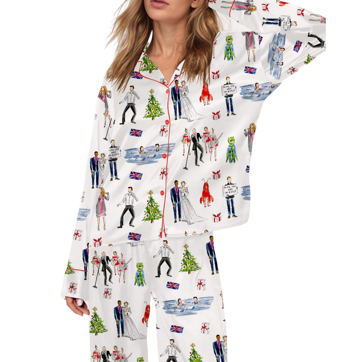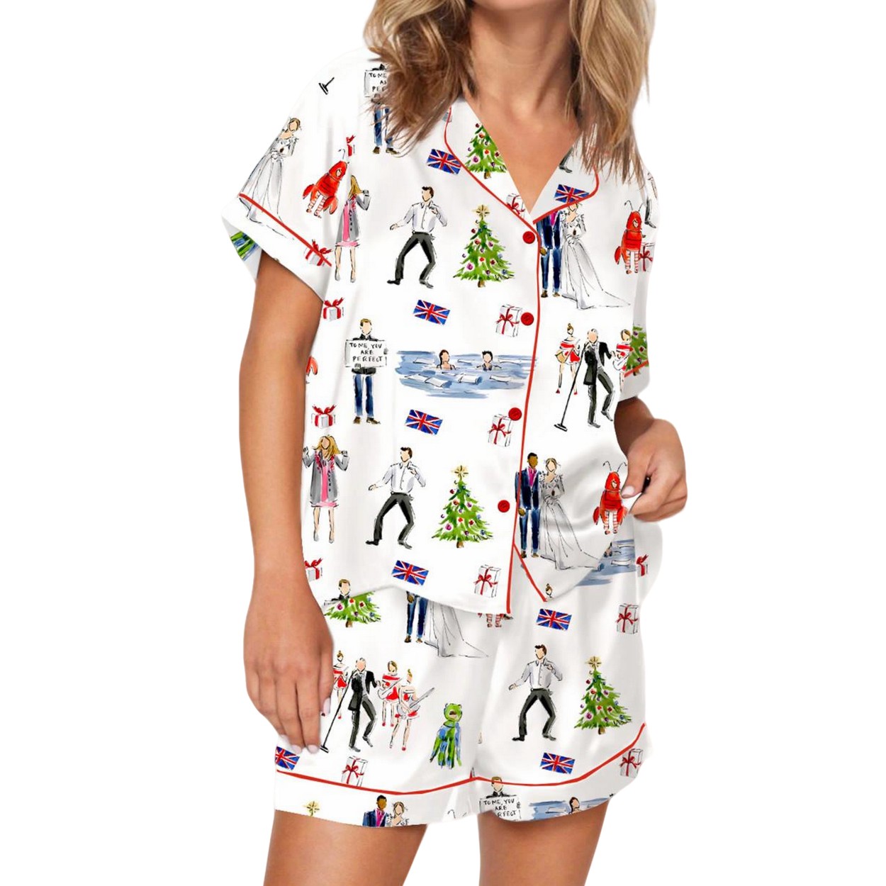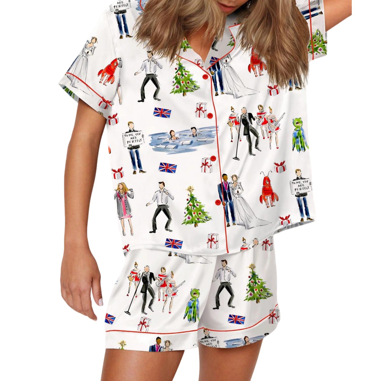 - Available in sizes XS to 4XL, this luxurious set features a whimsical design inspired by the beloved holiday movie, adorned with playful illustrations of Christmas trees, wedding scenes, and iconic British flags.