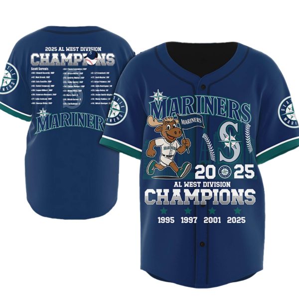 The front showcases the stylized ‘MARINERS’ script, the Mariners logo, and a spirited depiction of the team mascot, the Moose, running beneath the city skyline graphic. Boldly centered is the ‘2025 AL WEST DIVISION CHAMPIONS‘ text. Crucially, the jersey honors the franchise’s legacy by listing all AL West Division Championships: 1995, 1997, 2001, 2025. The back features the commemorative “2025 AL WEST DIVISION CHAMPIONS” banner and a full roster of the victorious players and their numbers, ensuring this is a unique collector’s item.