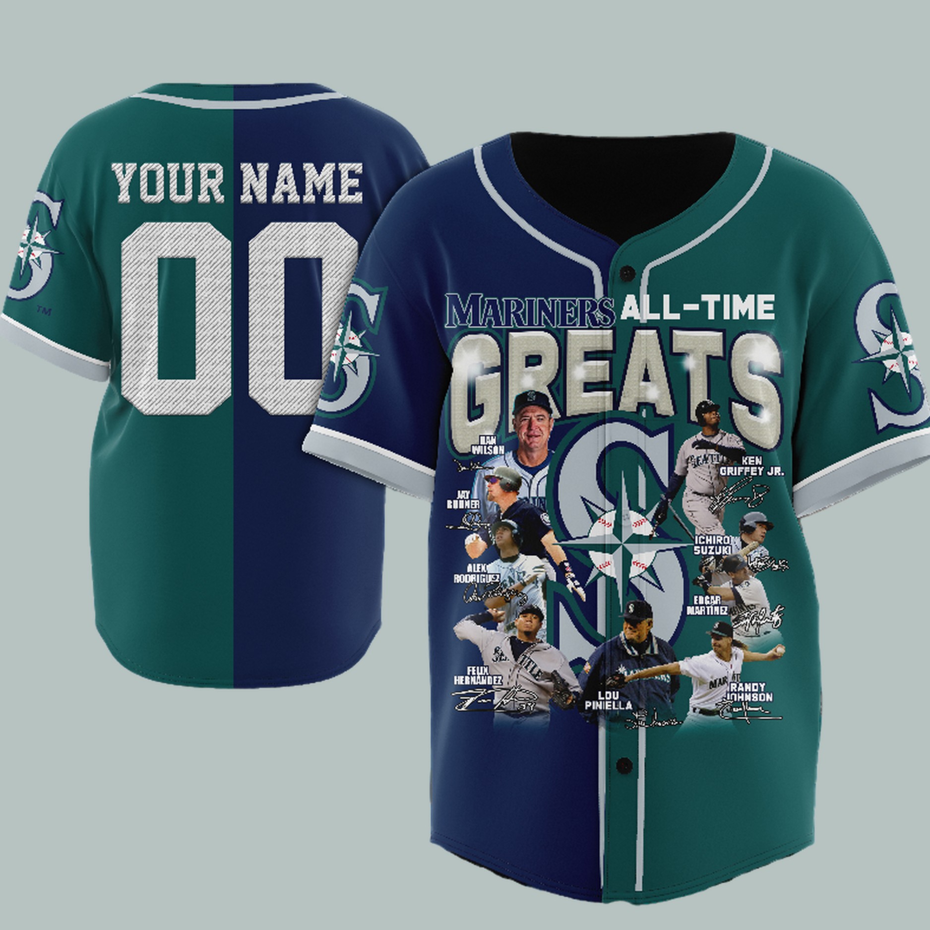Step up to the plate in style with the Mariners All-Time Greats Jersey, a must-have for any true fan. This unique, eye-catching design features a striking split-panel construction, dividing the jersey between the iconic teal and navy blue team colors. The back offers full customization with “YOUR NAME” and “00” (or your chosen number) in bold white lettering.