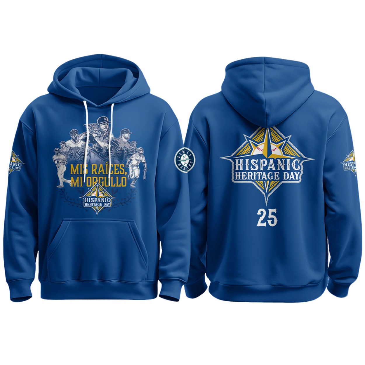 The front showcases a powerful graphic of Mariners baseball players in various dynamic poses, rendered in a stylized, almost artistic fashion. Below this, the phrase “MIS RAÍCES, MI ORGULLO” (My Roots, My Pride) is prominently displayed, flanked by a decorative emblem that reads “HISPANIC HERITAGE DAY.” On the back, a bold starburst design frames the “HISPANIC HERITAGE DAY” text, emphasizing the celebration, with the number “25” printed below – symbolizing the year 2025. The left sleeve features the classic Mariners compass logo. Available in an extensive range of sizes from S to 5XL, and crafted from comfortable polyester, this shirt offers a great fit for every fan.