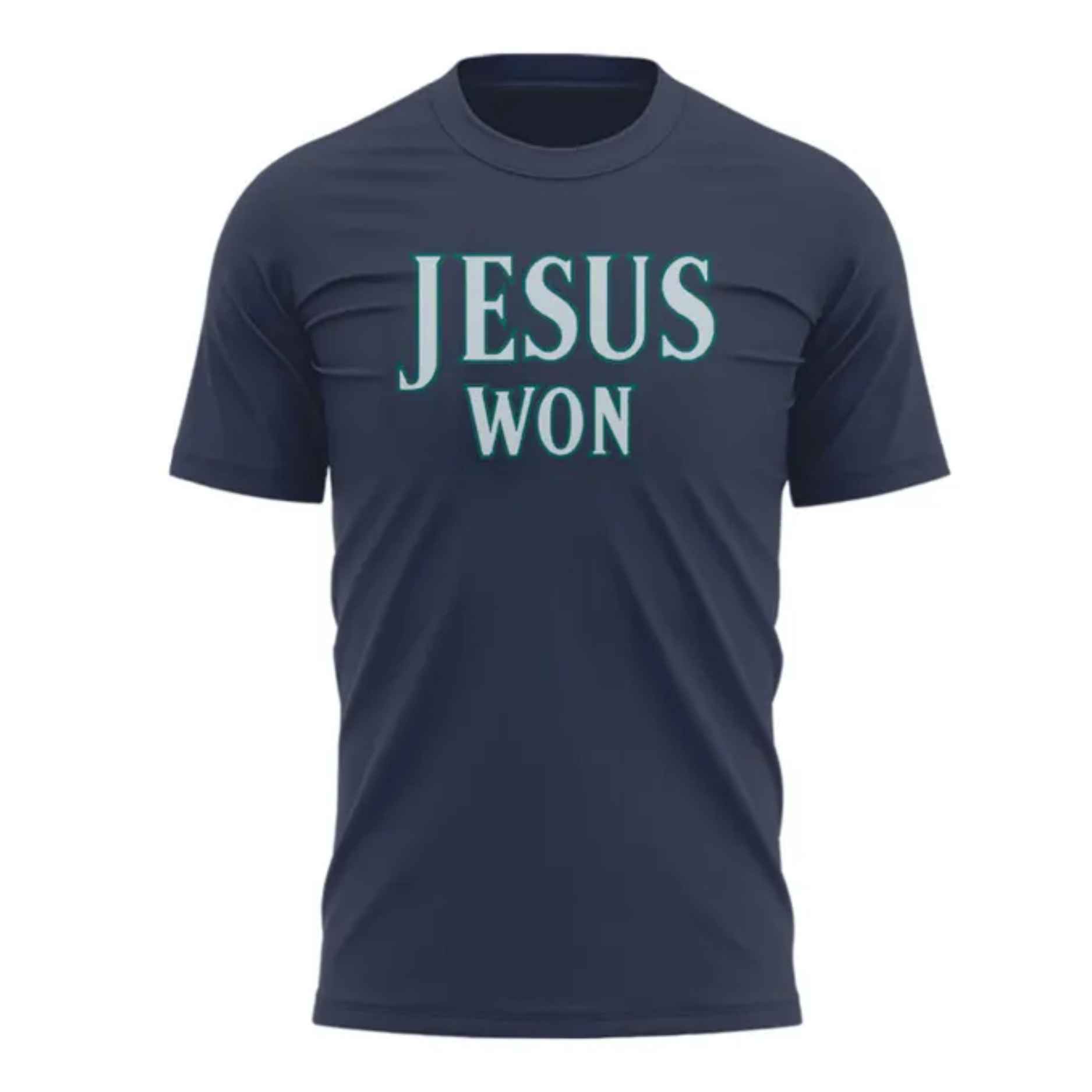 This T-shirt features a striking double-sided design on a deep navy blue background. The Front makes a clear, confident declaration: “JESUS WON” is printed in crisp, dual-tone lettering that incorporates Mariners colors (white and teal).