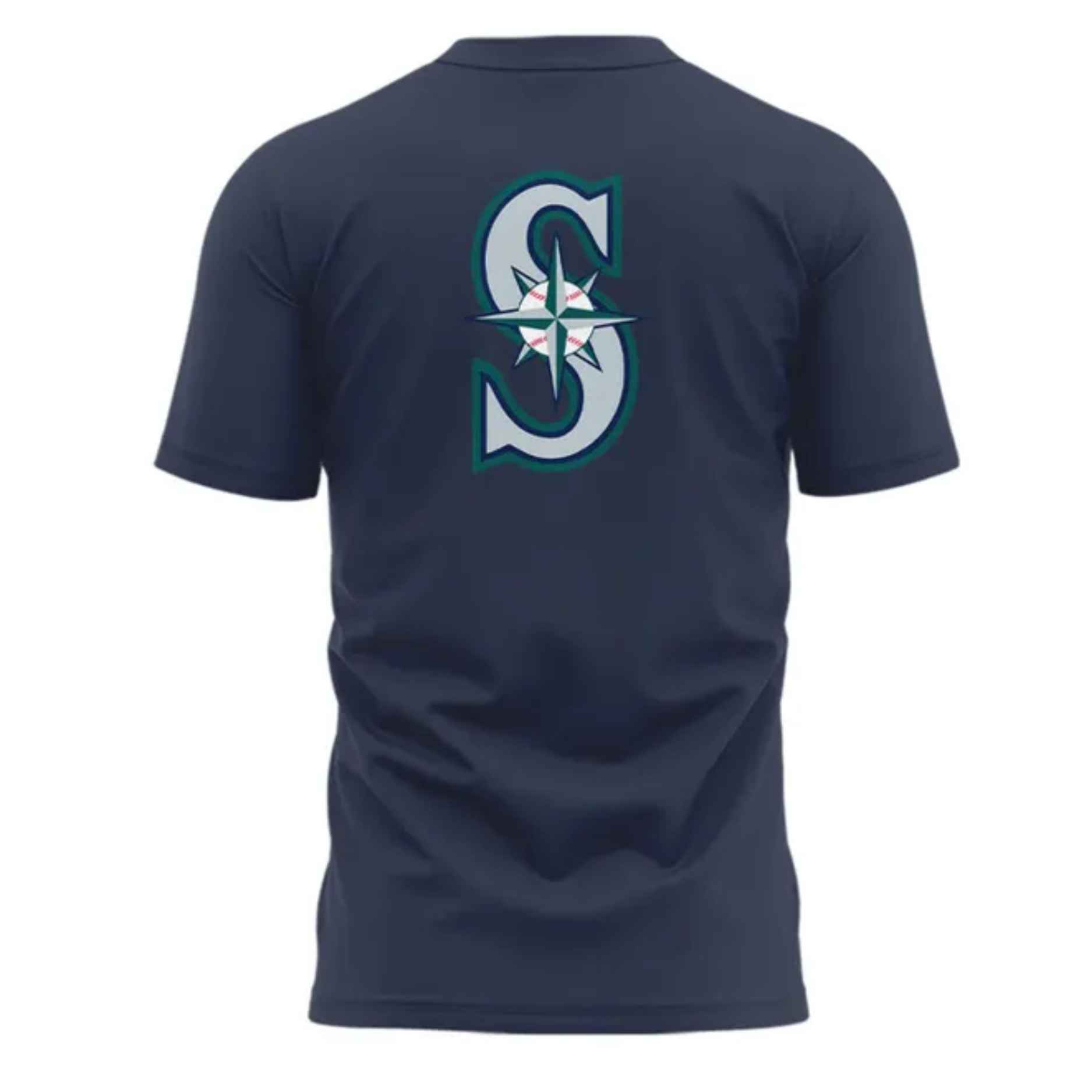 The Back proudly features the iconic Mariners “S” Compass Rose logo, rendered in classic team colors (navy, teal, and white).