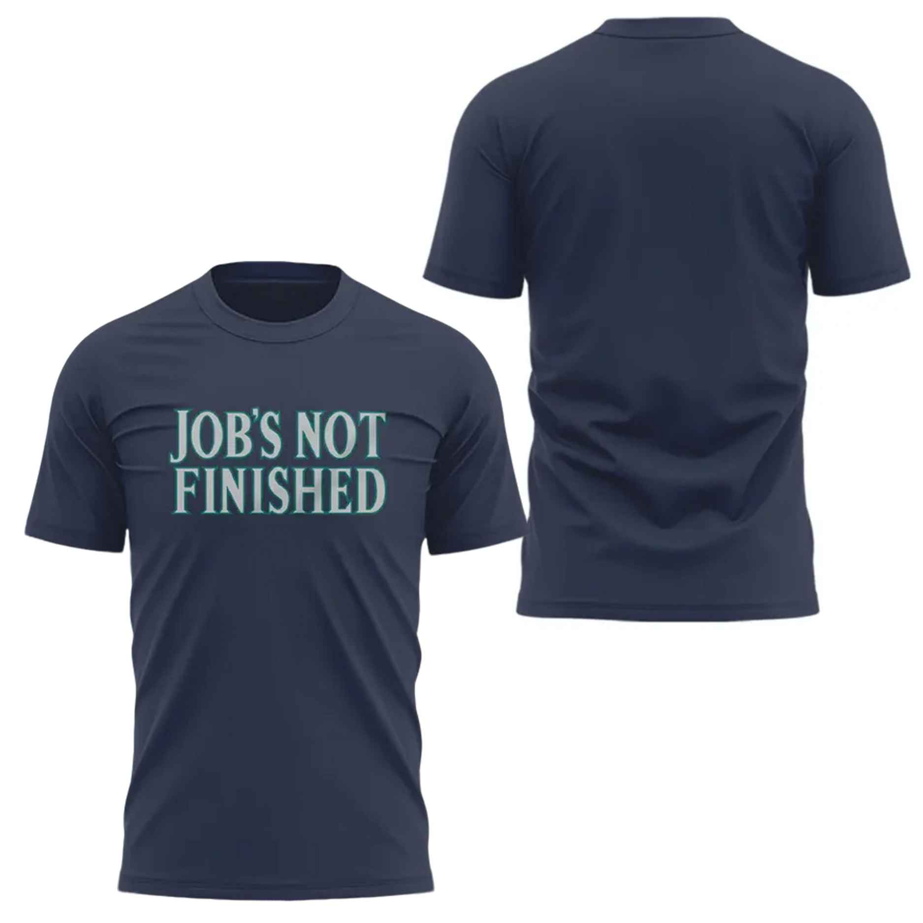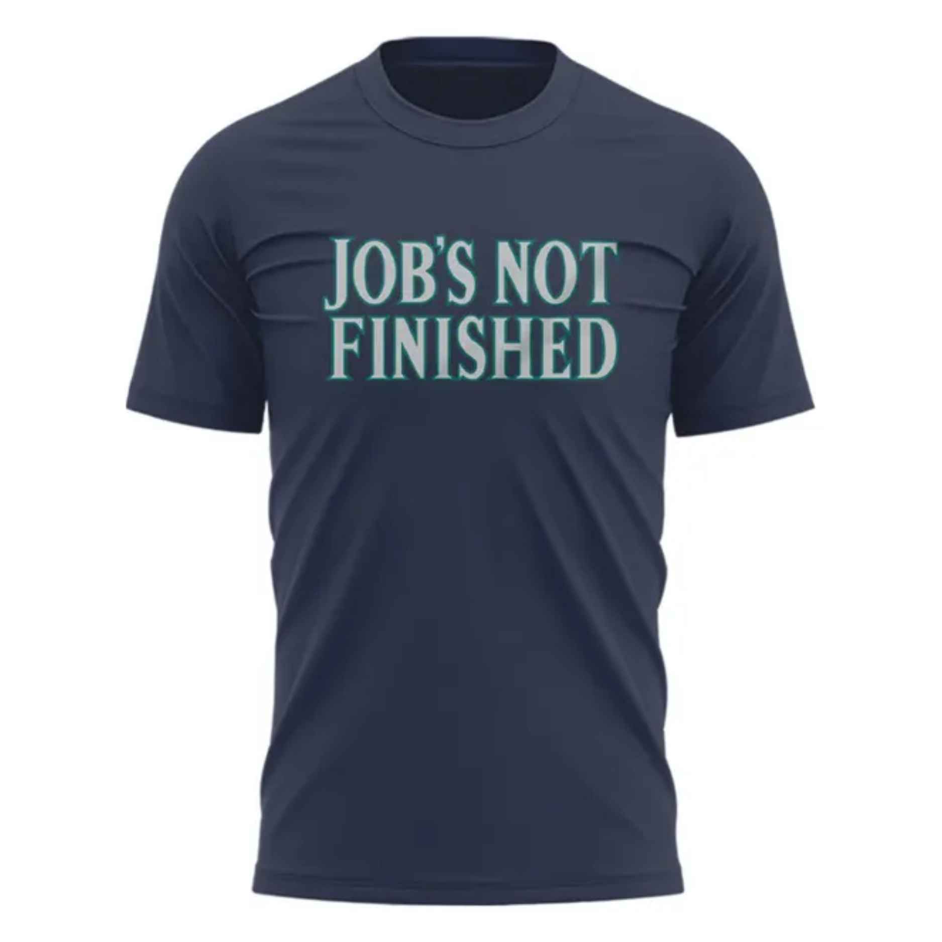 This T-shirt features a bold, impactful single-sided design on a deep Navy Blue background. The phrase “JOB’S NOT FINISHED” is printed prominently across the chest in large, stacked lettering.