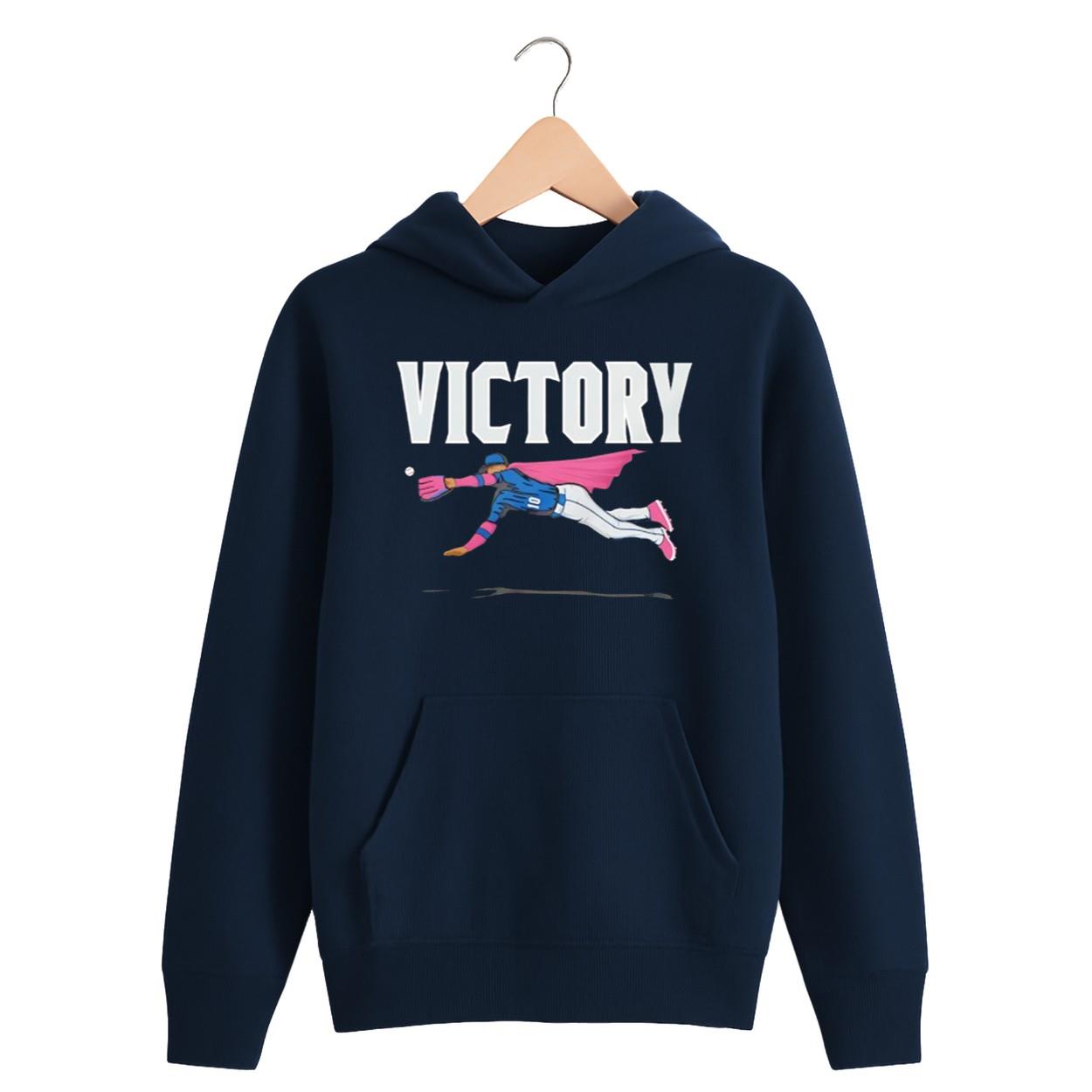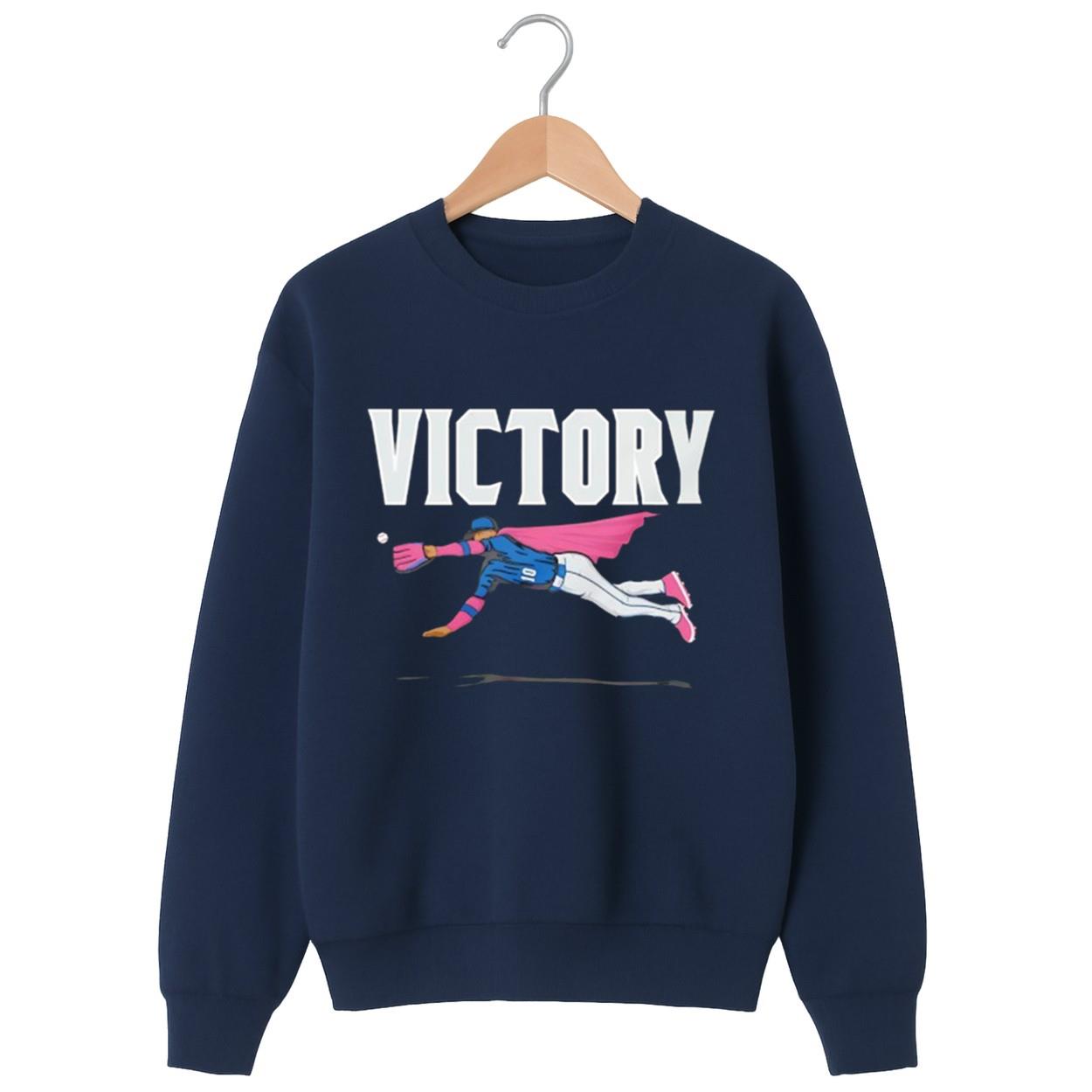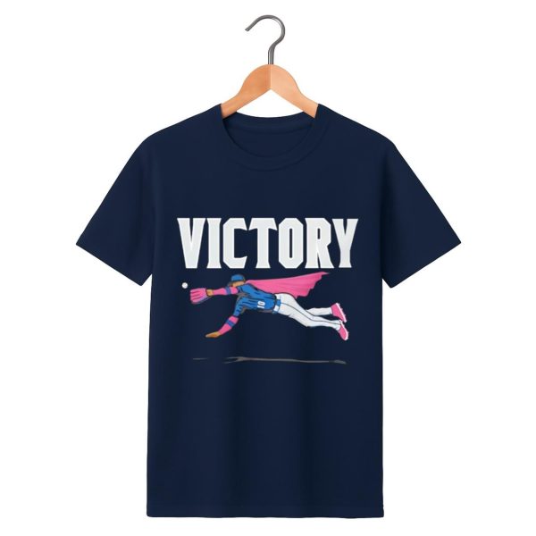The shirt features a deep Navy Blue background, providing a sharp contrast for the vibrant, dynamic graphic. The central image is a bold, comic-book-style illustration of Victor Robles in a full-out diving catch, complete with a stylized pink and blue Mariners uniform and a dramatic pink superhero cape. Above this thrilling action, the word “VICTORY” is emblazoned in bold white lettering.